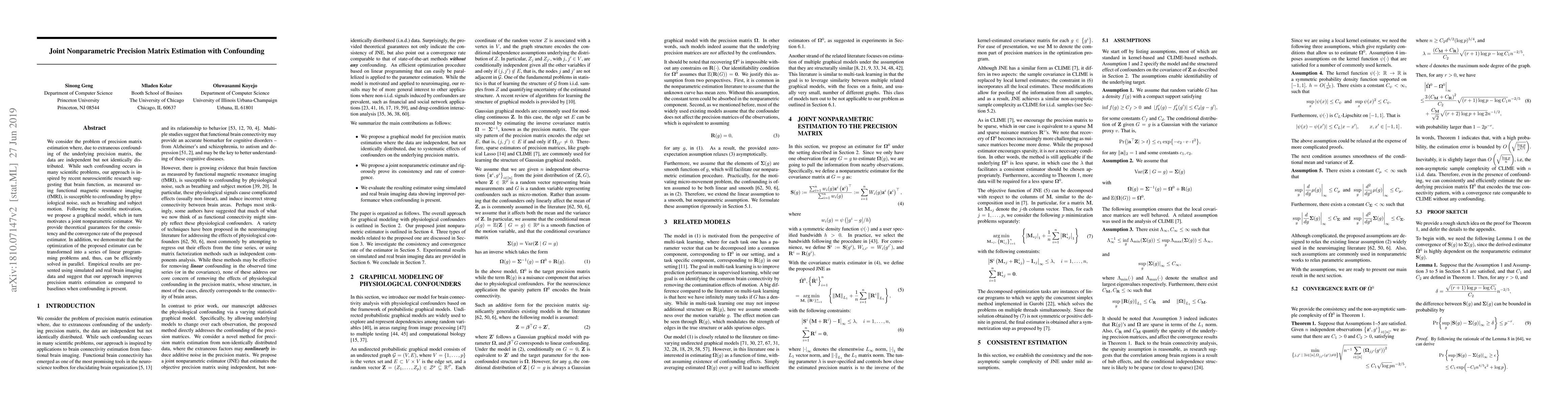 This paper proposes a joint nonparametric estimator for precision matrix estimation in the presence of confounding, motivated by neuroscience fMRI data. The method provides theoretical consistency and convergence guarantees, and its optimization can be efficiently solved via parallel linear programming. Empirical results show improved performance over baselines in both simulated and real brain imaging data.