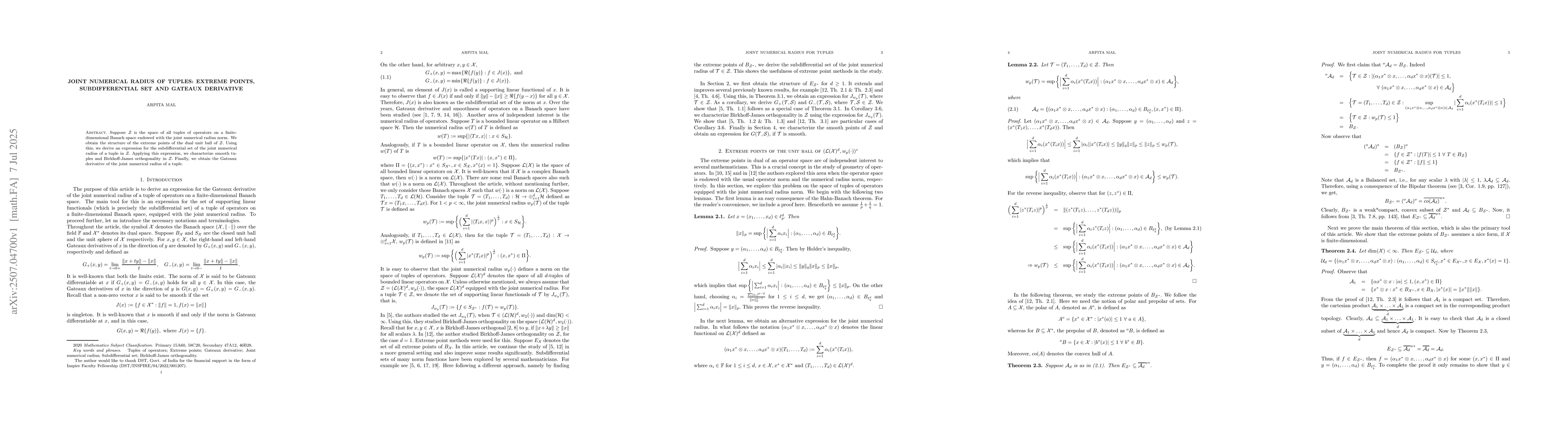 The paper provides a detailed analysis of the extreme points, subdifferential sets, and Gateaux derivatives related to the joint numerical radius of tuples in finite-dimensional Banach spaces.
