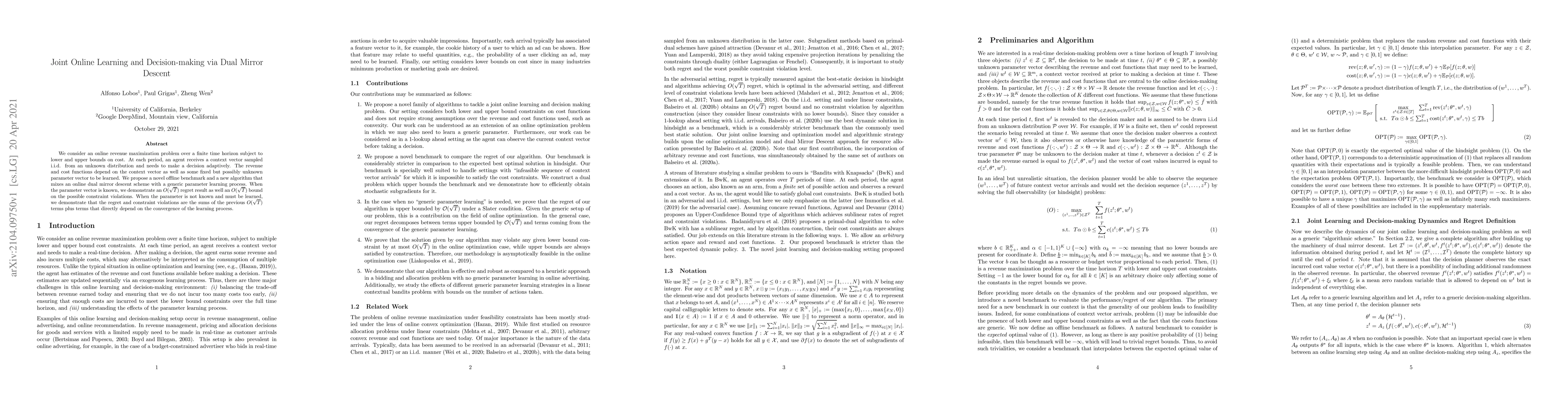 We consider an online revenue maximization problem over a finite time horizon subject to lower and upper bounds on cost. At each period, an agent receives a context vector sampled i.i.d. from an unknown distribution and needs to make a decision adaptively. The revenue and cost functions depend on the context vector as well as some fixed but possibly unknown parameter vector to be learned. We propose a novel offline benchmark and a new algorithm that mixes an online dual mirror descent scheme with a generic parameter learning process. When the parameter vector is known, we demonstrate an $O(\sqrt{T})$ regret result as well an $O(\sqrt{T})$ bound on the possible constraint violations. When the parameter is not known and must be learned, we demonstrate that the regret and constraint violations are the sums of the previous $O(\sqrt{T})$ terms plus terms that directly depend on the convergence of the learning process.