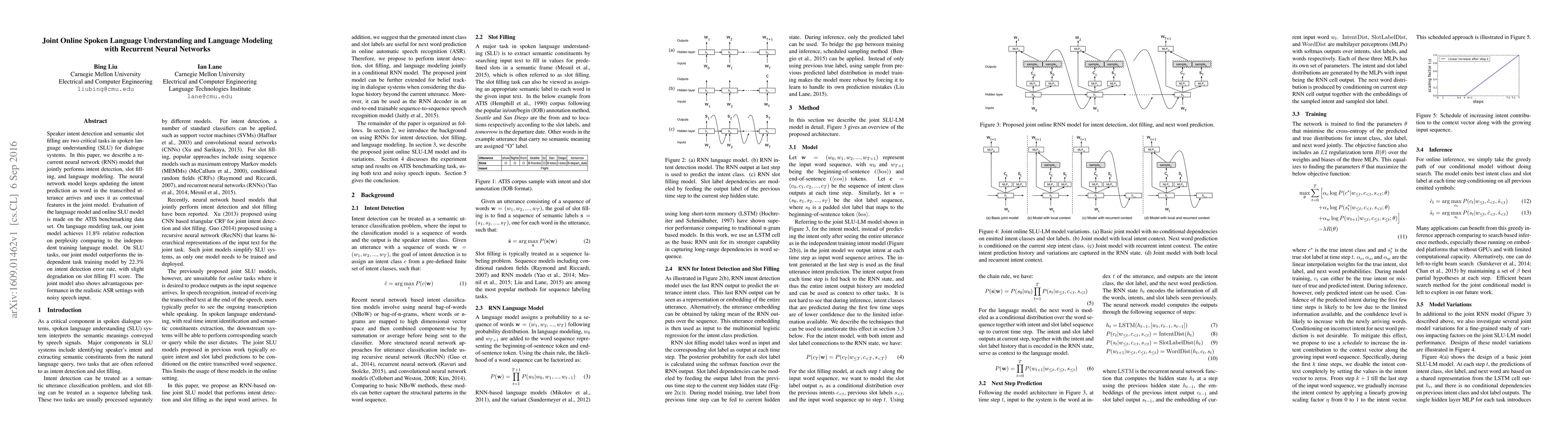 This paper presents a recurrent neural network (RNN) model that jointly performs intent detection, slot filling, and language modeling for spoken language understanding in dialogue systems. The joint model shows significant improvements in language modeling and intent detection, achieving 11.8% reduction in perplexity and 22.3% reduction in intent detection error rate compared to independent models.