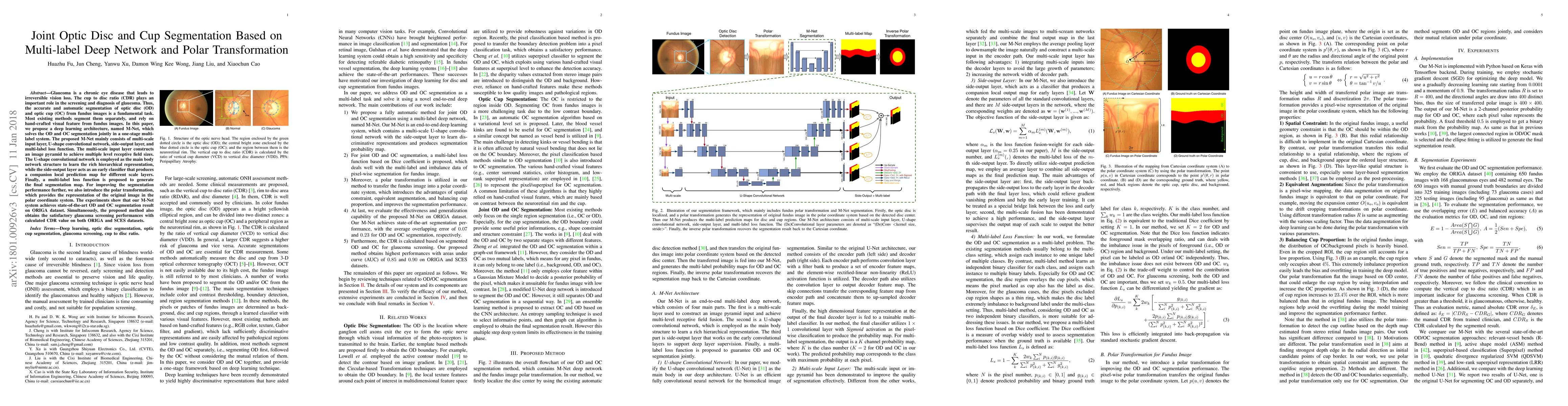 This paper proposes a deep learning architecture, M-Net, for joint optic disc and cup segmentation in fundus images using a multi-label system and polar transformation, achieving state-of-the-art results on ORIGA and SCES datasets for glaucoma screening.