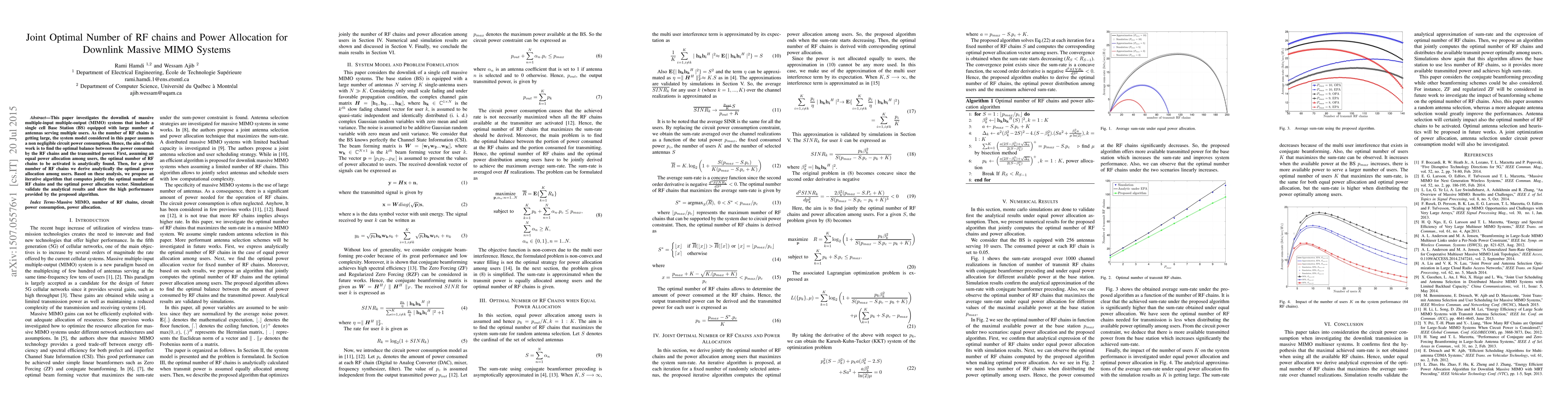 This paper proposes an iterative algorithm to jointly optimize the number of RF chains and power allocation in downlink massive MIMO systems, balancing circuit power consumption with transmitted power. Simulation results validate the analytical findings and demonstrate the algorithm's high performance.