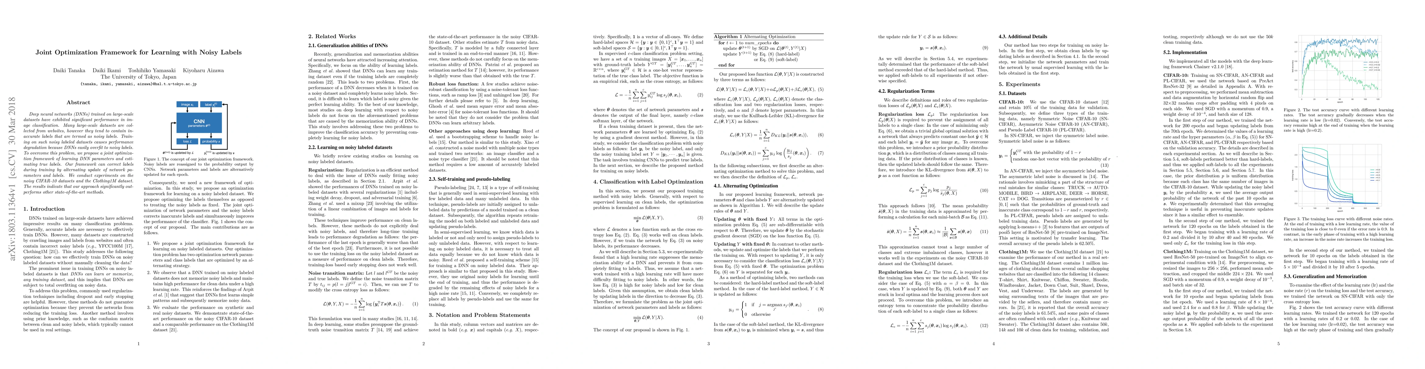 This paper proposes a joint optimization framework to address performance degradation in deep neural networks (DNNs) caused by training on datasets with noisy labels. The framework alternates between updating DNN parameters and estimating true labels, demonstrating superior performance on the CIFAR-10 and Clothing1M datasets compared to other methods.