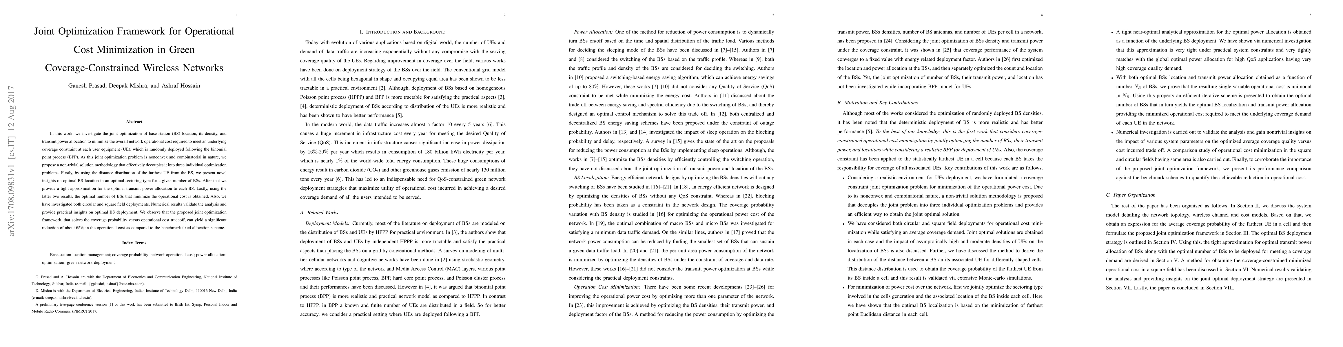 This paper proposes a joint optimization framework to minimize operational costs in green coverage-constrained wireless networks by optimizing base station location, density, and transmit power allocation. The methodology decouples the nonconvex problem into three parts, yielding significant reductions in operational costs by about 65% compared to fixed allocation schemes.