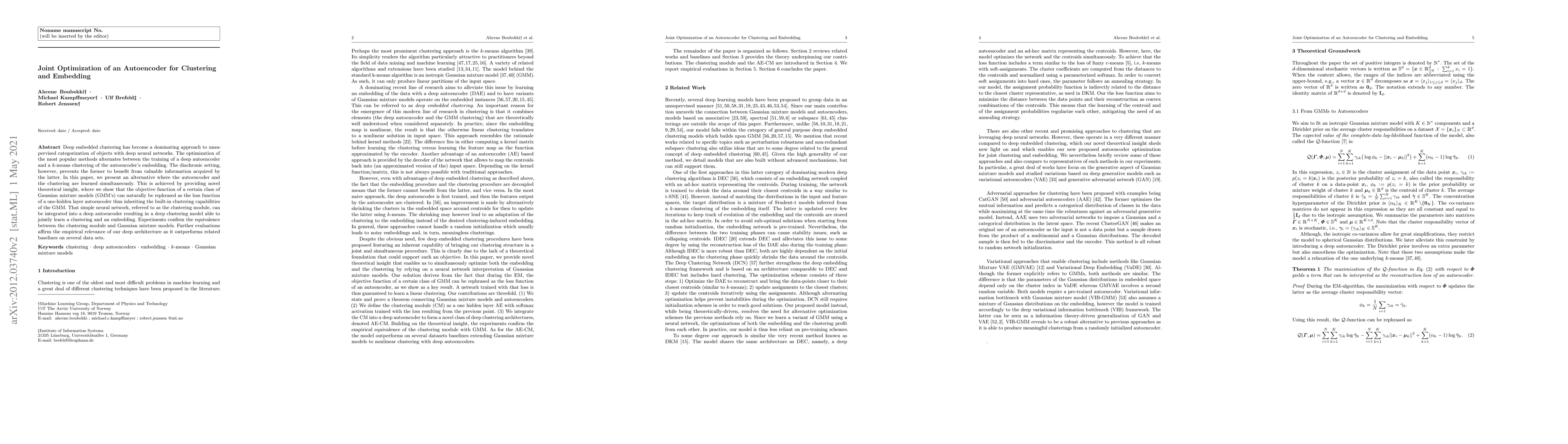 This paper proposes a joint optimization method for a deep autoencoder and clustering, integrating a clustering module into the autoencoder to learn both clustering and embedding simultaneously. Experiments demonstrate the equivalence between the clustering module and Gaussian mixture models, and the proposed deep clustering model outperforms existing methods on various datasets.