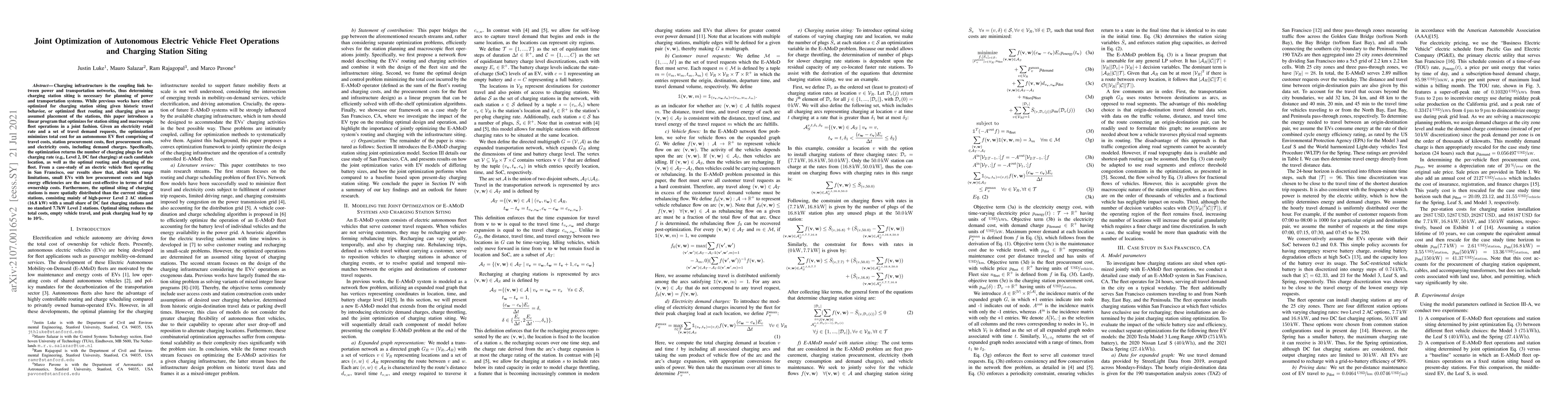 This paper presents a linear program for jointly optimizing the siting of charging stations and the operations of an autonomous electric vehicle fleet, minimizing total costs including travel, procurement, and electricity expenses. Results from a San Francisco case study indicate that small, energy-efficient EVs and strategically distributed high-power charging stations can reduce total costs and peak charging loads by up to 10%.