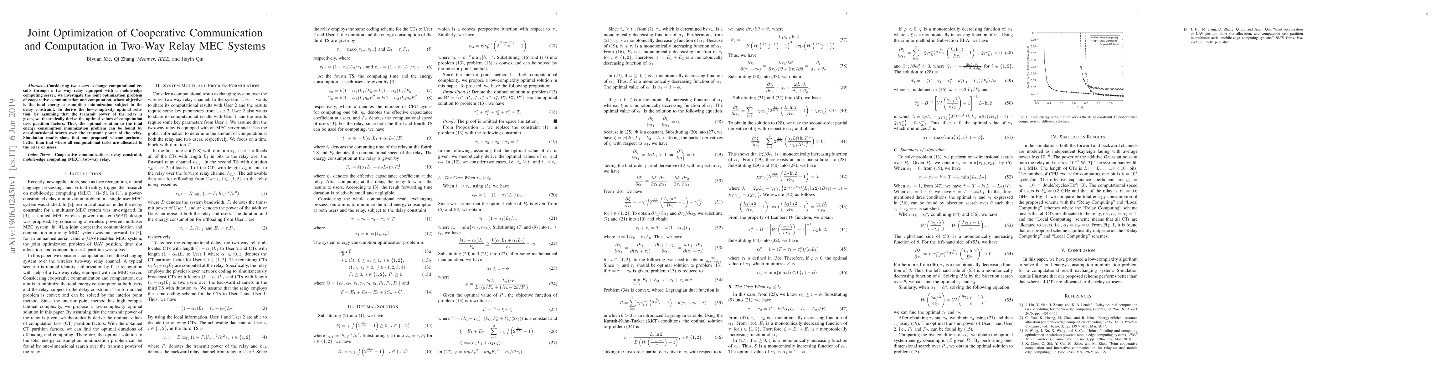 Considering two users exchange computational results through a two-way relay equipped with a mobile-edge computing server, we investigate the joint optimization problem of cooperative communication and computation, whose objective is the total energy consumption minimization subject to the delay constraint. To derive the low-complexity optimal solution, by assuming that the transmit power of the relay is given, we theoretically derive the optimal values of computation task partition factors. Thus, the optimal solution to the total energy consumption minimization problem can be found by one-dimensional search over the transmit power of the relay. Simulation results show that our proposed scheme performs better than that where all computational tasks are allocated to the relay or users.