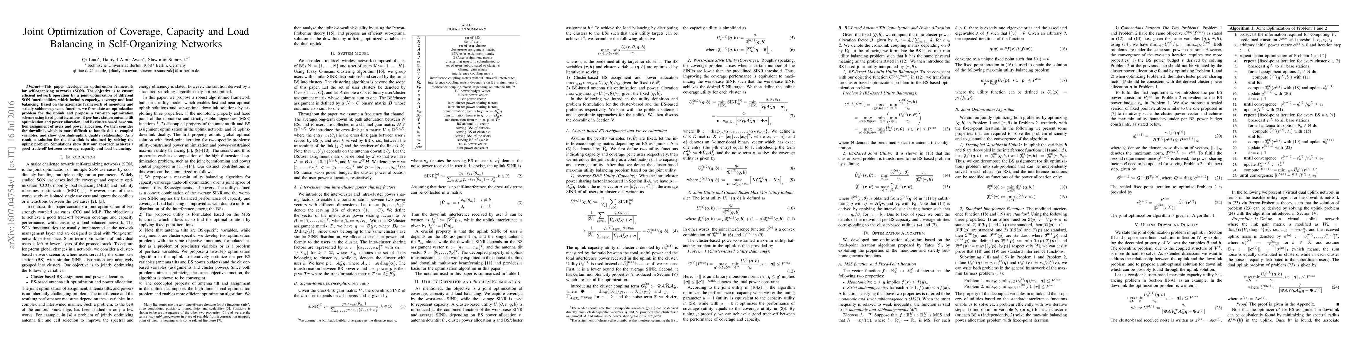 This paper proposes an optimization framework for self-organizing networks (SON) to jointly optimize coverage, capacity, and load balancing. It uses a two-step scheme for the uplink and leverages downlink-uplink duality to achieve efficient network operation.