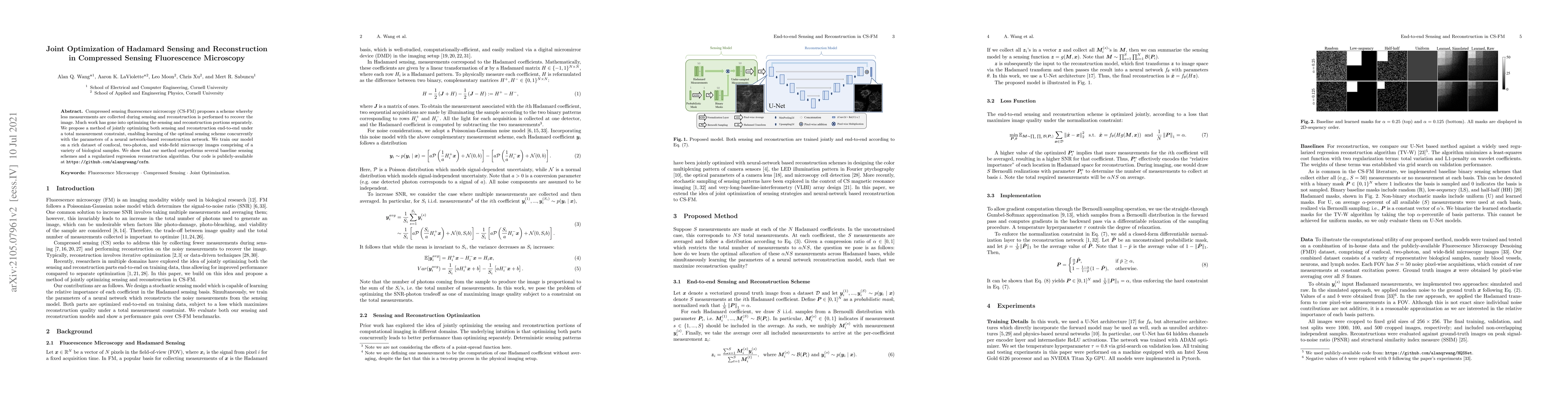 This paper proposes a joint optimization method for Hadamard sensing and reconstruction in compressed sensing fluorescence microscopy, aiming to improve both sensing and reconstruction simultaneously. The method outperforms baseline schemes and regularized regression reconstruction, as demonstrated on a diverse dataset of microscopy images.