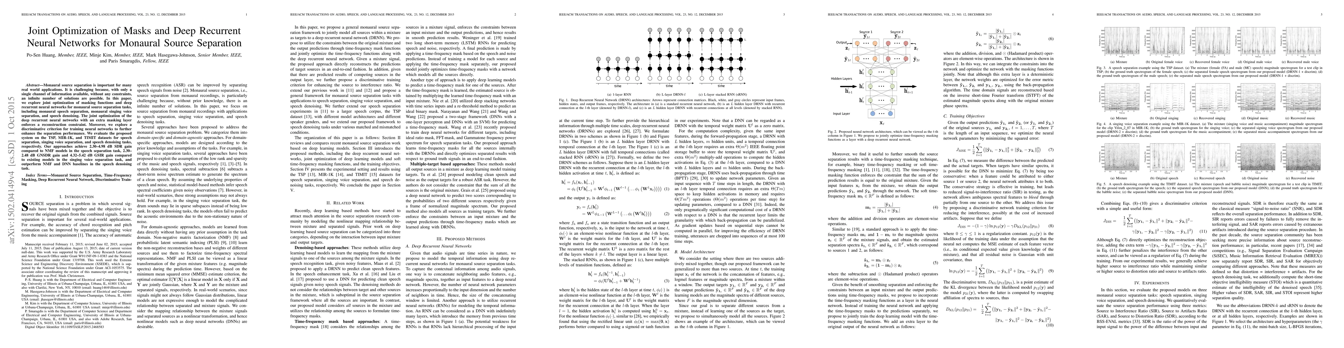 This paper proposes a joint optimization method combining masking functions and deep recurrent neural networks for monaural source separation, achieving significant improvements over existing models in speech, singing voice separation, and speech denoising tasks. The approach demonstrates an SDR gain of 2.30--4.98 dB and outperforms baselines across various datasets.