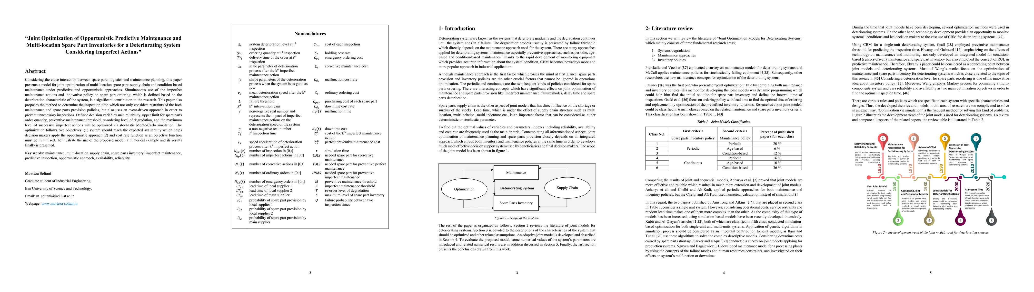 This paper develops a joint optimization model for integrating multi-location spare parts supply chain management with condition-based maintenance, considering imperfect maintenance actions. The model aims to maximize system availability while minimizing cost, using stochastic simulation to optimize decision variables.