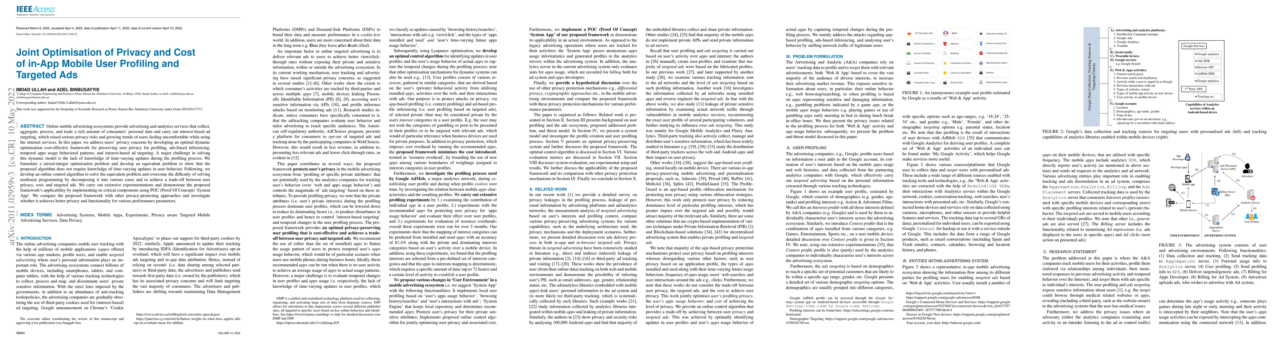 Online mobile advertising ecosystems provide advertising and analytics services that collect, aggregate, process, and trade a rich amount of consumers' personal data and carry out interest-based ad targeting, which raised serious privacy risks and growing trends of users feeling uncomfortable while using the internet services. In this paper, we address users' privacy concerns by developing an optimal dynamic optimisation cost-effective framework for preserving user privacy for profiling, ads-based inferencing, temporal apps usage behavioral patterns, and interest-based ad targeting. A major challenge in solving this dynamic model is the lack of knowledge of time-varying updates during the profiling process. We formulate a mixed-integer optimisation problem and develop an equivalent problem to show that the proposed algorithm does not require knowledge of time-varying updates in user behavior. Following, we develop an online control algorithm to solve the equivalent problem and overcome the difficulty of solving nonlinear programming by decomposing it into various cases and to achieve a trade-off between user privacy, cost, and targeted ads. We carry out extensive experimentations and demonstrate the proposed framework's applicability by implementing its critical components using POC (Proof Of Concept) `System App'. We compare the proposed framework with other privacy-protecting approaches and investigate whether it achieves better privacy and functionality for various performance parameters.