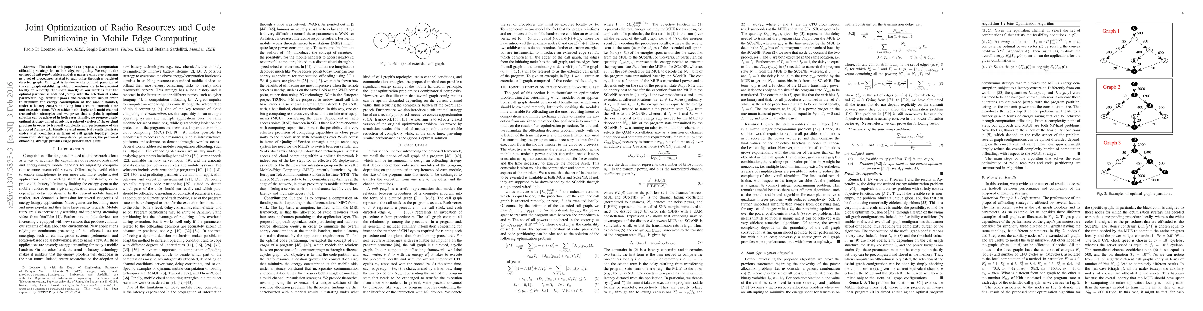 The aim of this paper is to propose a computation offloading strategy for mobile edge computing. We exploit the concept of call graph, which models a generic computer program as a set of procedures related to each other through a weighted directed graph. Our goal is to derive the optimal partition of the call graph establishing which procedures are to be executed locally or remotely. The main novelty of our work is that the optimal partition is obtained jointly with the selection of radio parameters, e.g., transmit power and constellation size, in order to minimize the energy consumption at the mobile handset, under a latency constraint taking into account transmit time and execution time. We consider both single and multi-channel transmission strategies and we prove that a globally optimal solution can be achieved in both cases. Finally, we propose a suboptimal strategy aimed at solving a relaxed version of the original problem in order to tradeoff complexity and performance of the proposed framework. Finally, several numerical results illustrate under what conditions in terms of call graph topology, communication strategy, and computation parameters, the proposed offloading strategy provides large performance gains.