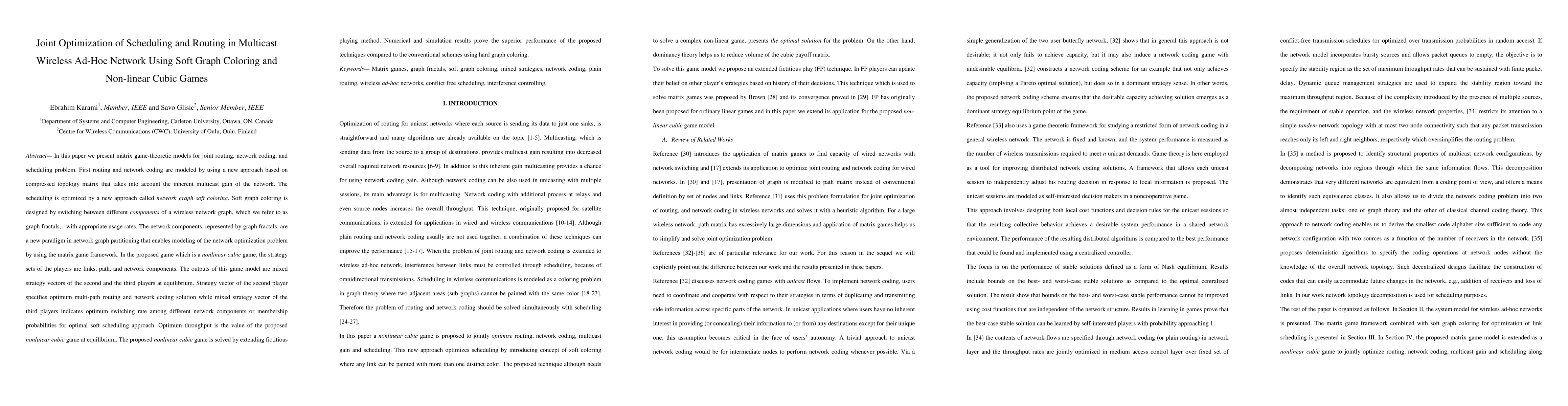 In this paper we present matrix game-theoretic models for joint routing, network coding, and scheduling problem. First routing and network coding are modeled by using a new approach based on compressed topology matrix that takes into account the inherent multicast gain of the network. The scheduling is optimized by a new approach called network graph soft coloring. Soft graph coloring is designed by switching between different components of a wireless network graph, which we refer to as graph fractals, with appropriate usage rates. The network components, represented by graph fractals, are a new paradigm in network graph partitioning that enables modeling of the network optimization problem by using the matrix game framework. In the proposed game which is a nonlinear cubic game, the strategy sets of the players are links, path, and network components. The outputs of this game model are mixed strategy vectors of the second and the third players at equilibrium. Strategy vector of the second player specifies optimum multi-path routing and network coding solution while mixed strategy vector of the third players indicates optimum switching rate among different network components or membership probabilities for optimal soft scheduling approach. Optimum throughput is the value of the proposed nonlinear cubic game at equilibrium. The proposed nonlinear cubic game is solved by extending fictitious playing method. Numerical and simulation results prove the superior performance of the proposed techniques compared to the conventional schemes using hard graph coloring.