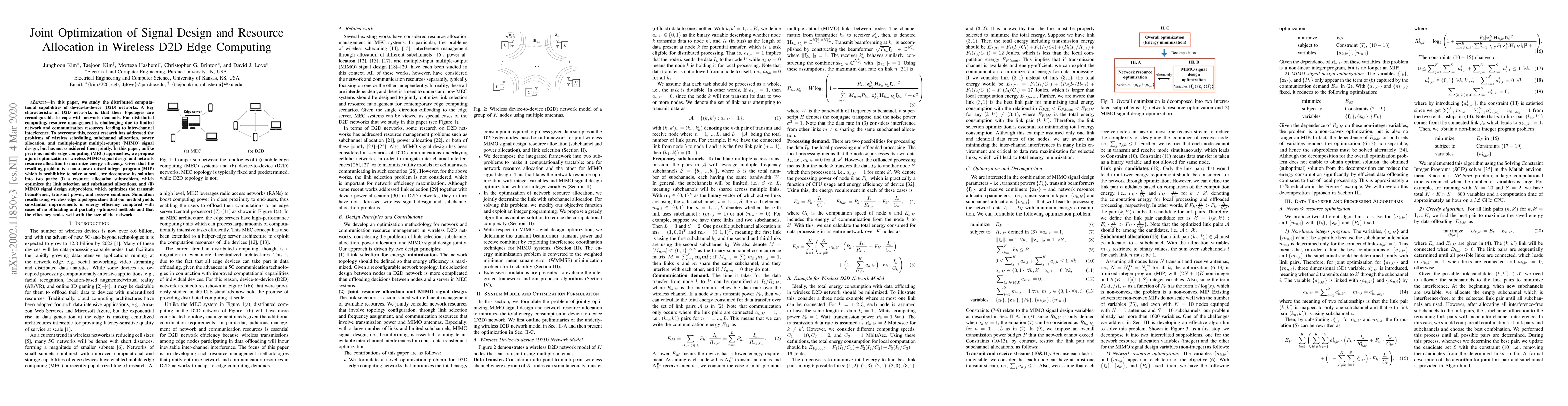 This paper proposes a joint optimization framework for wireless MIMO signal design and resource allocation in D2D edge computing to maximize energy efficiency. The non-convex problem is decomposed into resource allocation and MIMO signal design subproblems, demonstrating significant improvements in energy efficiency over traditional methods.