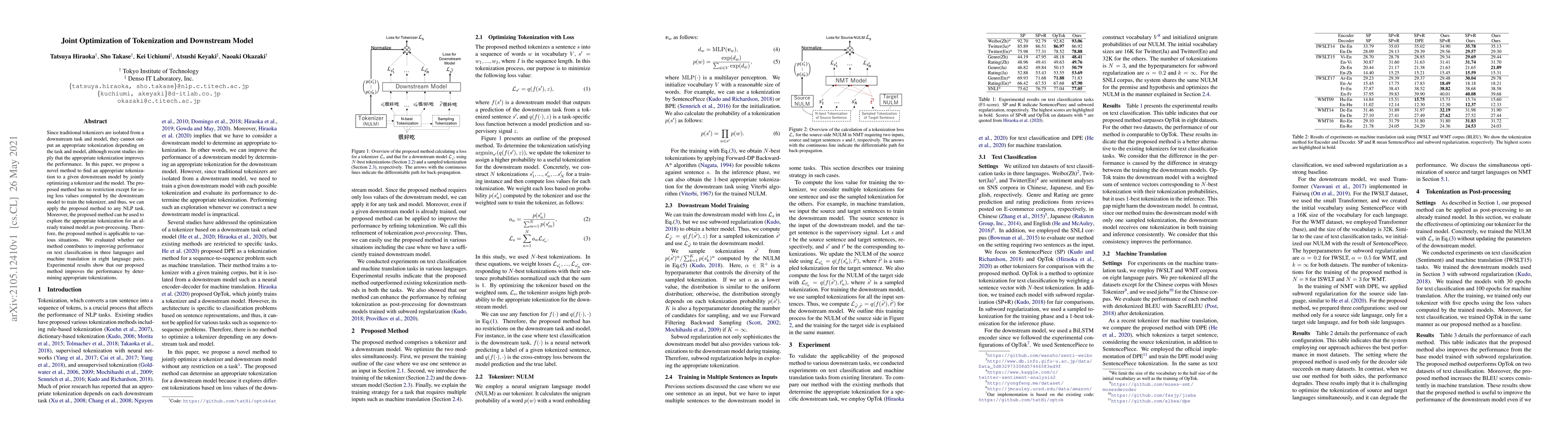 Since traditional tokenizers are isolated from a downstream task and model, they cannot output an appropriate tokenization depending on the task and model, although recent studies imply that the appropriate tokenization improves the performance. In this paper, we propose a novel method to find an appropriate tokenization to a given downstream model by jointly optimizing a tokenizer and the model. The proposed method has no restriction except for using loss values computed by the downstream model to train the tokenizer, and thus, we can apply the proposed method to any NLP task. Moreover, the proposed method can be used to explore the appropriate tokenization for an already trained model as post-processing. Therefore, the proposed method is applicable to various situations. We evaluated whether our method contributes to improving performance on text classification in three languages and machine translation in eight language pairs. Experimental results show that our proposed method improves the performance by determining appropriate tokenizations.