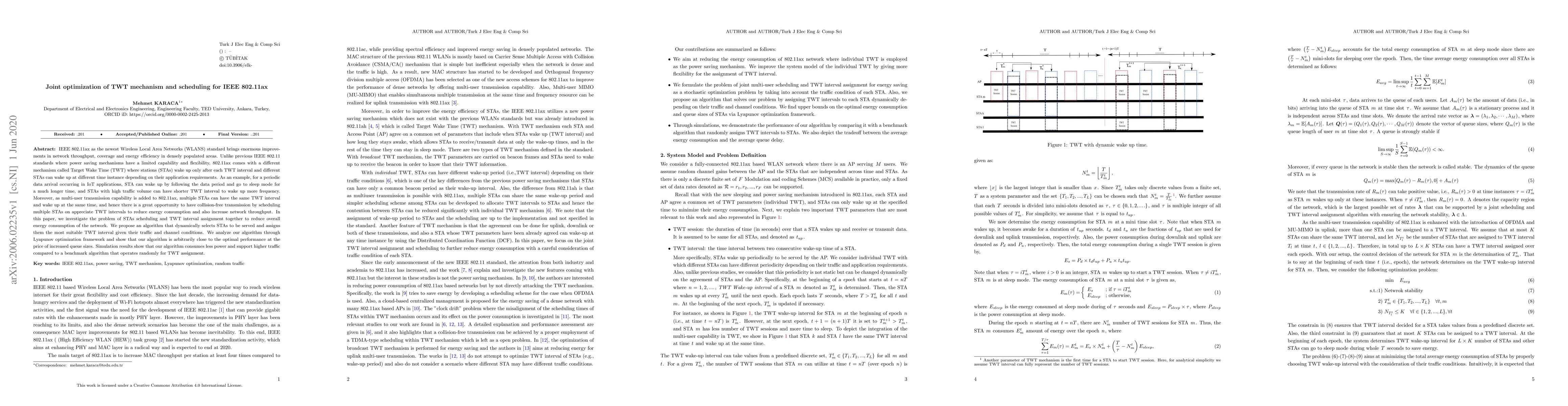 This paper proposes an algorithm to jointly optimize the Target Wake Time (TWT) mechanism and scheduling for IEEE 802.11ax networks to reduce energy consumption and enhance throughput. The algorithm dynamically assigns TWT intervals based on traffic and channel conditions, leveraging Lyapunov optimization to achieve near-optimal performance. Simulation results demonstrate lower power consumption and higher traffic support compared to a random TWT assignment benchmark.