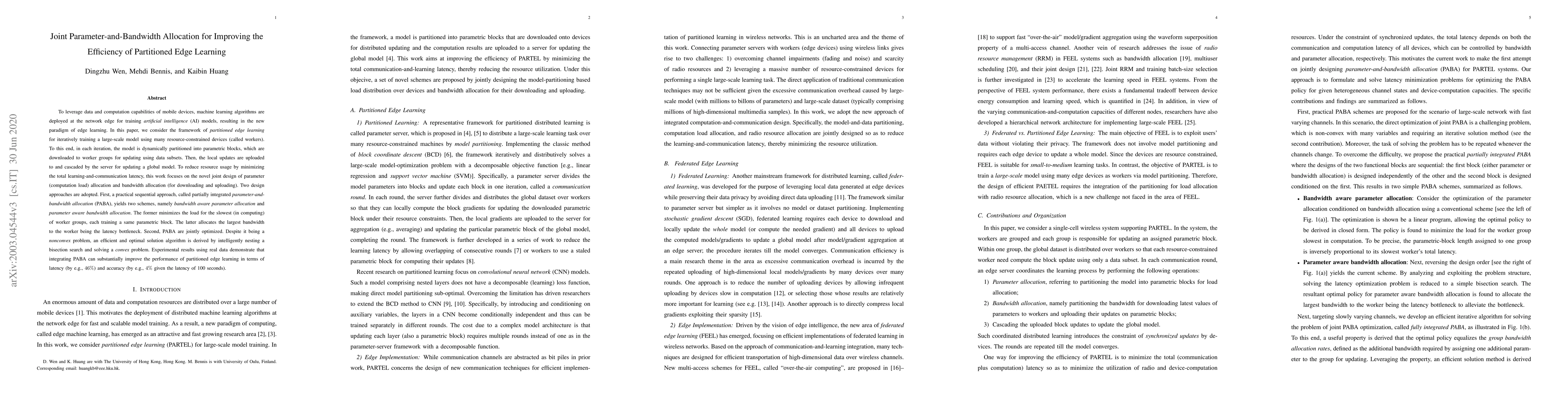 This paper explores joint parameter and bandwidth allocation strategies for improving the efficiency of partitioned edge learning, where large-scale models are iteratively trained on resource-constrained devices. Two approaches are proposed: bandwidth aware parameter allocation and parameter aware bandwidth allocation, followed by their joint optimization using a bisection search algorithm. Experimental results show significant reductions in latency and improvements in accuracy.