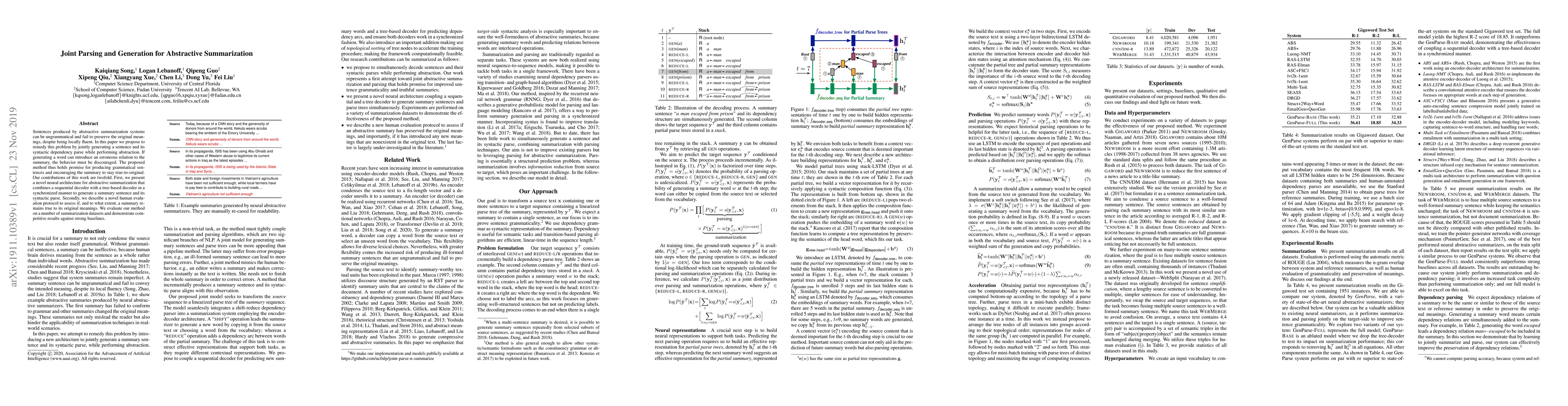 This paper proposes a novel neural architecture for abstractive summarization that jointly generates a summary sentence and its syntactic dependency parse, aiming to produce grammatical sentences that preserve original meanings. The method combines a sequential decoder with a tree-based decoder, and a new human evaluation protocol is introduced to assess the fidelity of summaries.