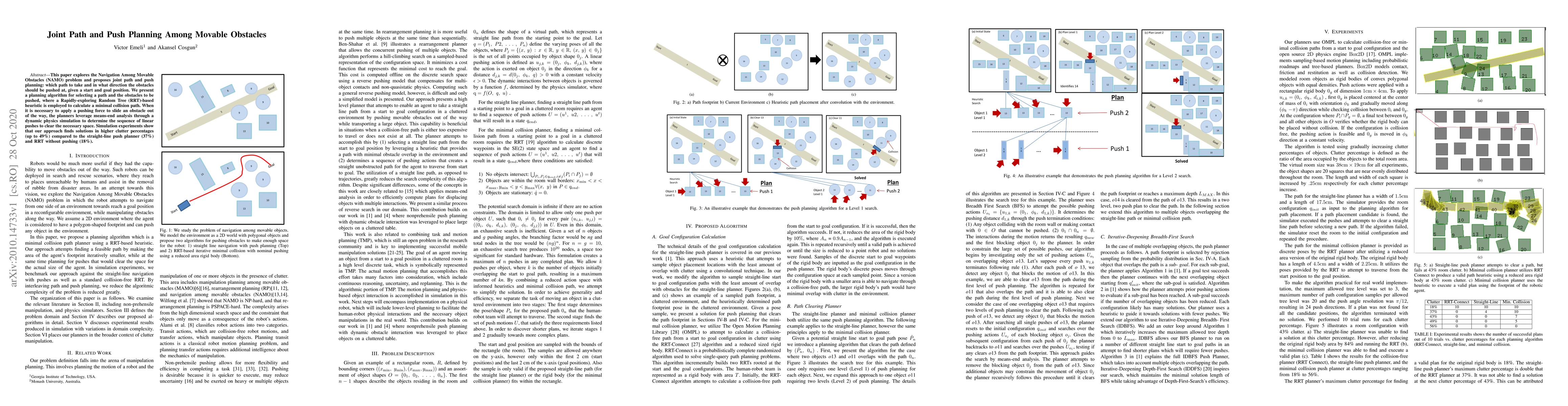 This paper proposes a joint path and push planning algorithm for navigating through environments with movable obstacles, employing RRT-based heuristics and means-end analysis with dynamic physics simulations. Simulation results demonstrate superior performance in higher clutter environments compared to traditional methods.