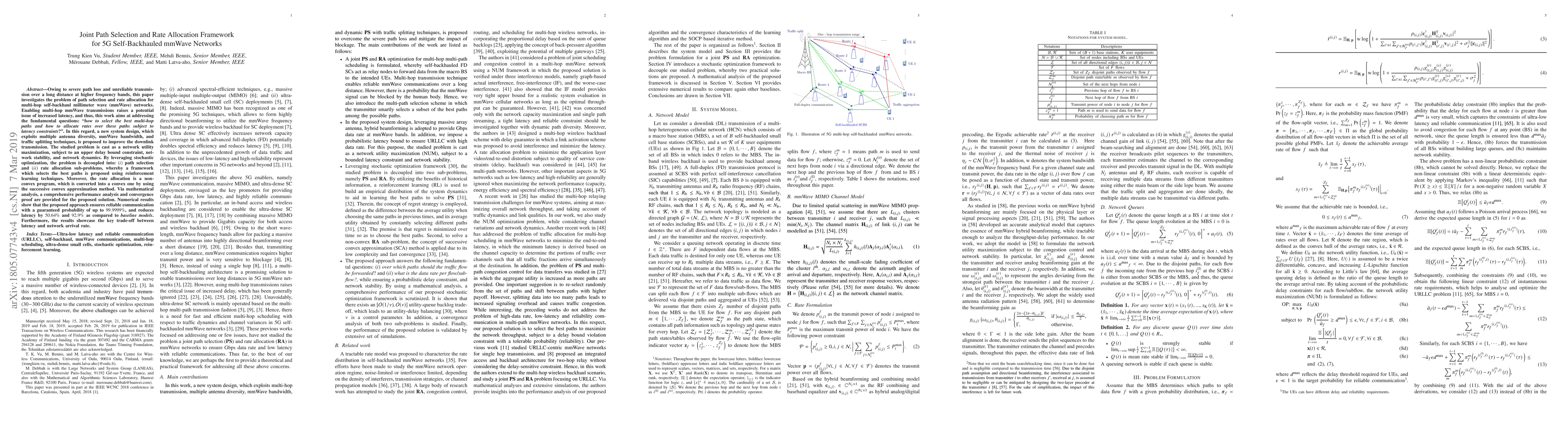 Owing to severe path loss and unreliable transmission over a long distance at higher frequency bands, we investigate the problem of path selection and rate allocation for multi-hop self-backhaul millimeter wave (mmWave) networks. Enabling multi-hop mmWave transmissions raises a potential issue of increased latency, and thus, in this work we aim at addressing the fundamental questions: how to select the best multi-hop paths and how to allocate rates over these paths subject to latency constraints? In this regard, we propose a new system design, which exploits multiple antenna diversity, mmWave bandwidth, and traffic splitting techniques to improve the downlink transmission. The studied problem is cast as a network utility maximization, subject to an upper delay bound constraint, network stability, and network dynamics. By leveraging stochastic optimization, the problem is decoupled into: path selection and rate allocation sub-problems, whereby a framework which selects the best paths is proposed using reinforcement learning techniques. Moreover, the rate allocation is a nonconvex program, which is converted into a convex one by using the successive convex approximation method. Via mathematical analysis, we provide a comprehensive performance analysis and convergence proofs for the proposed solution. Numerical results show that our approach ensures reliable communication with a guaranteed probability of up to $99.9999\%$, and reduces latency by $50.64\%$ and $92.9\%$ as compared to baseline models. Furthermore, the results showcase the key trade-off between latency and network arrival rate.