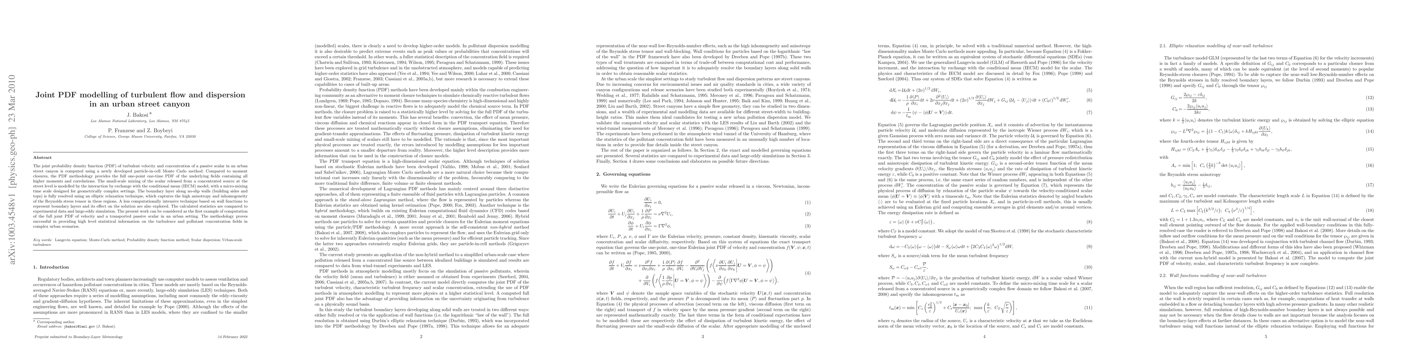 The joint probability density function (PDF) of turbulent velocity and concentration of a passive scalar in an urban street canyon is computed using a newly developed particle-in-cell Monte Carlo method. Compared to moment closures, the PDF methodology provides the full one-point one-time PDF of the underlying fields containing all higher moments and correlations. The small-scale mixing of the scalar released from a concentrated source at the street level is modelled by the interaction by exchange with the conditional mean (IECM) model, with a micro-mixing time scale designed for geometrically complex settings. The boundary layer along no-slip walls (building sides and tops) is fully resolved using an elliptic relaxation technique, which captures the high anisotropy and inhomogeneity of the Reynolds stress tensor in these regions. A less computationally intensive technique based on wall functions to represent boundary layers and its effect on the solution are also explored. The calculated statistics are compared to experimental data and large-eddy simulation. The present work can be considered as the first example of computation of the full joint PDF of velocity and a transported passive scalar in an urban setting. The methodology proves successful in providing high level statistical information on the turbulence and pollutant concentration fields in complex urban scenarios.