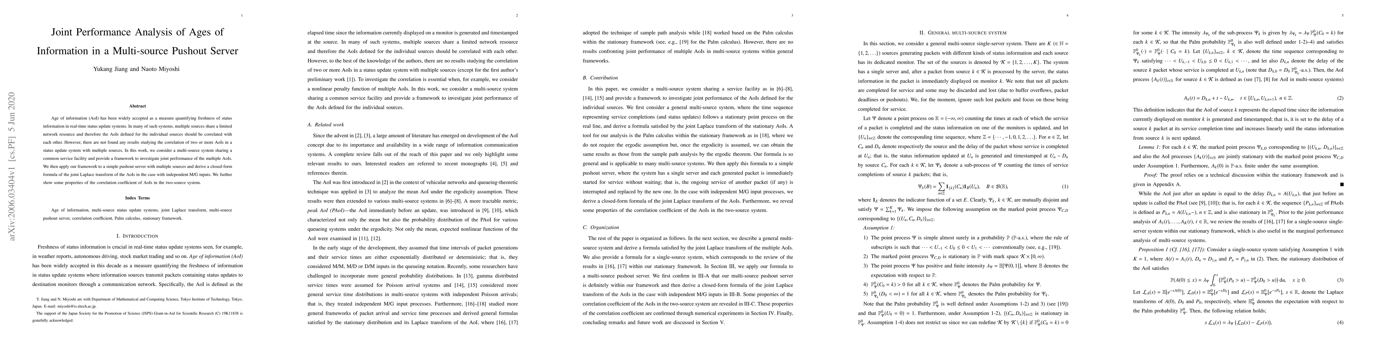 The paper provides a framework to investigate the joint performance of multiple AoIs in multi-source status update systems, applying it to a simple pushout server with multiple sources and deriving a closed-form formula for the joint Laplace transform of AoIs with independent M/G inputs.