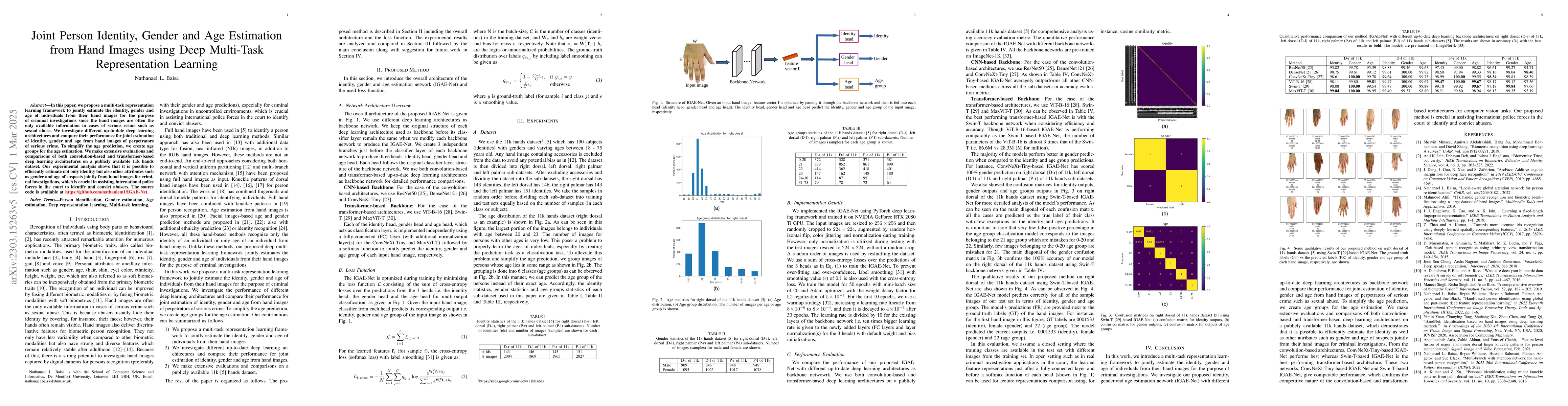 This paper proposes a deep multi-task learning framework to jointly estimate identity, gender, and age from hand images for criminal investigations, especially in cases of serious crimes like sexual abuse. The study evaluates convolution-based and transformer-based architectures on a dataset of 11k hand images, demonstrating the effectiveness of the approach in aiding police forces in suspect identification.