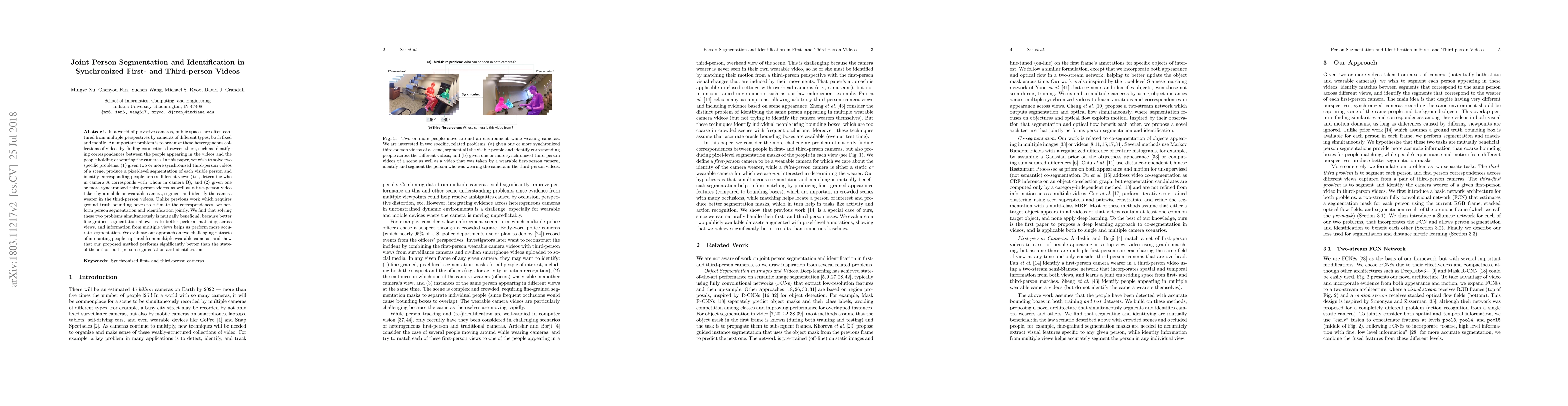 This paper proposes a method for joint person segmentation and identification in synchronized first- and third-person videos, addressing the challenge of matching people across different camera perspectives without requiring ground truth bounding boxes. The method significantly outperforms state-of-the-art on datasets with interacting people captured from multiple wearable cameras.