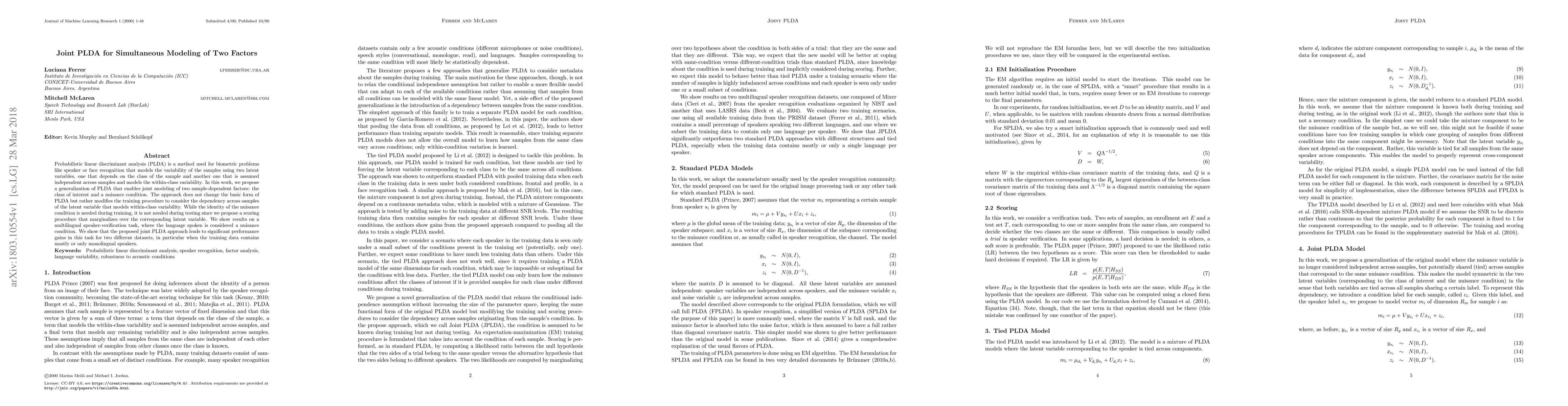 This research introduces a modified PLDA (Probabilistic Linear Discriminant Analysis) method for simultaneously modeling two factors in biometric tasks, like speaker recognition. The approach jointly considers the class of interest and a nuisance condition, such as language in a multilingual speaker verification task, enhancing performance, especially when training data is mostly monolingual.
