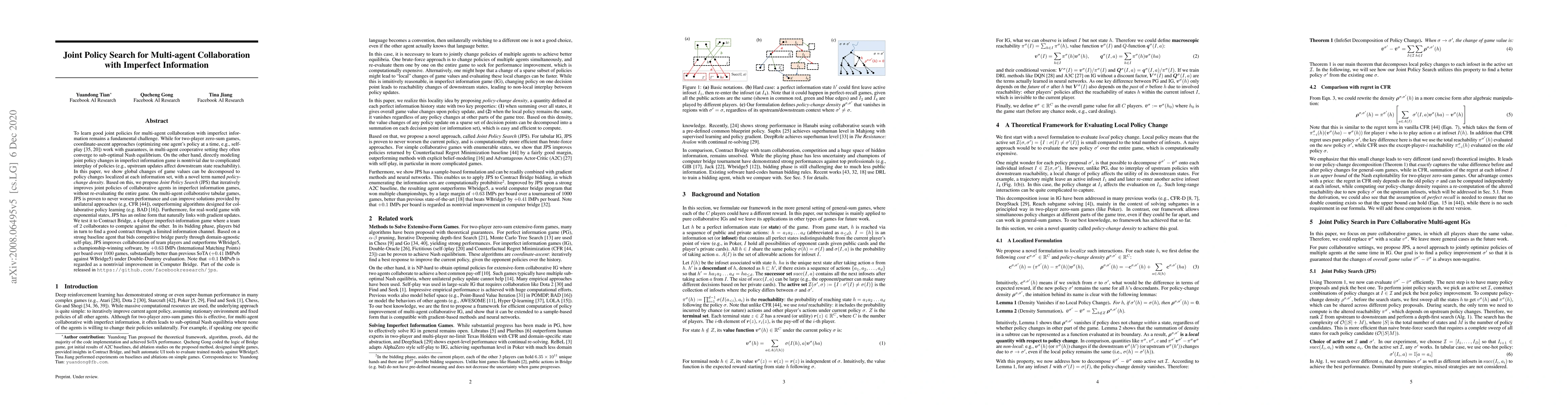 This paper introduces Joint Policy Search (JPS), a method to iteratively improve joint policies for multi-agent collaboration in imperfect information games. JPS decomposes global game value changes into localized policy changes, enhancing performance over baselines and outperforming existing collaborative algorithms, as demonstrated in Contract Bridge.