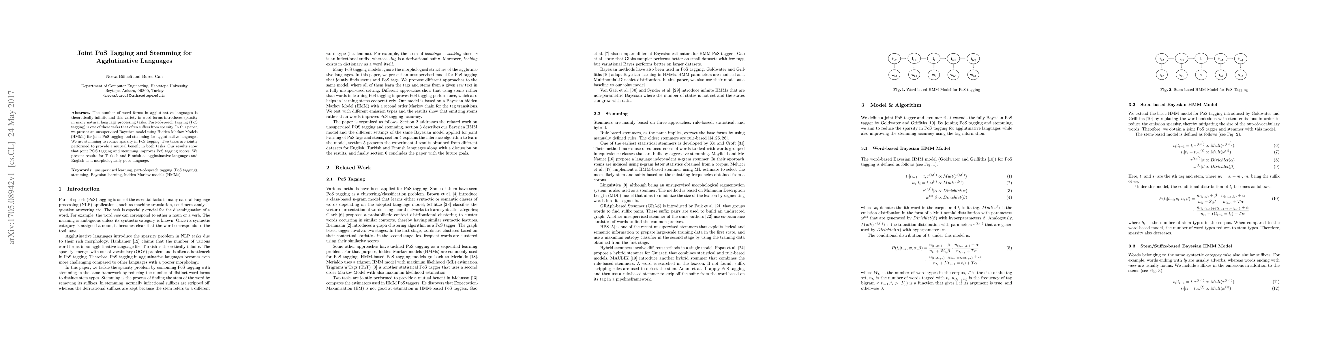 This paper proposes an unsupervised Bayesian model using Hidden Markov Models for joint part-of-speech tagging and stemming in agglutinative languages like Turkish and Finnish, aiming to reduce sparsity. Results indicate improved PoS tagging performance through the mutual benefit of jointly performing tagging and stemming.