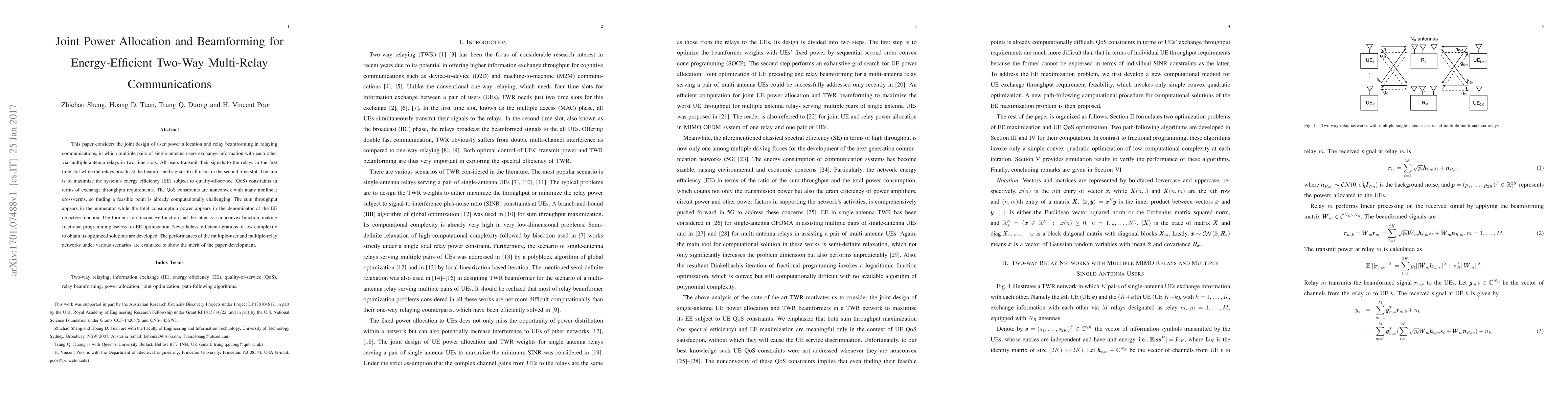 This paper optimizes power allocation and relay beamforming for energy-efficient two-way multi-relay communications, aiming to maximize energy efficiency under nonconvex QoS constraints. Efficient low-complexity algorithms are developed to address the nonconcave and nonconvex nature of the optimization problem.