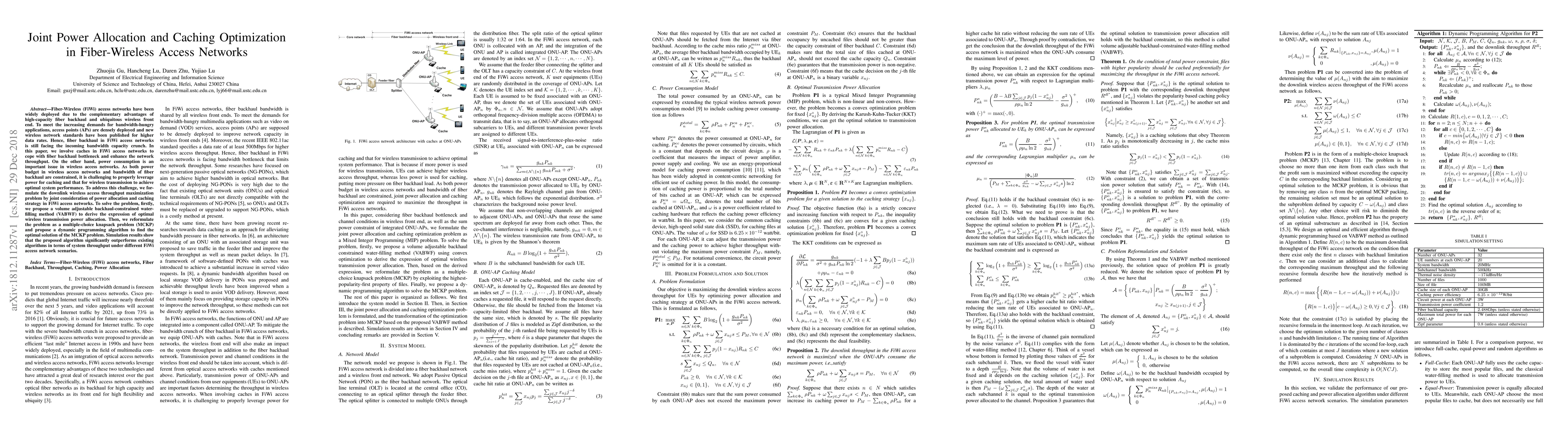 This paper proposes a method for optimizing power allocation and caching in Fiber-Wireless access networks to enhance throughput and address bandwidth constraints. It introduces a volume adjustable backhaul-constrained water-filling method and a dynamic programming algorithm to maximize downlink wireless access through joint power allocation and caching strategy, achieving superior performance compared to existing algorithms.