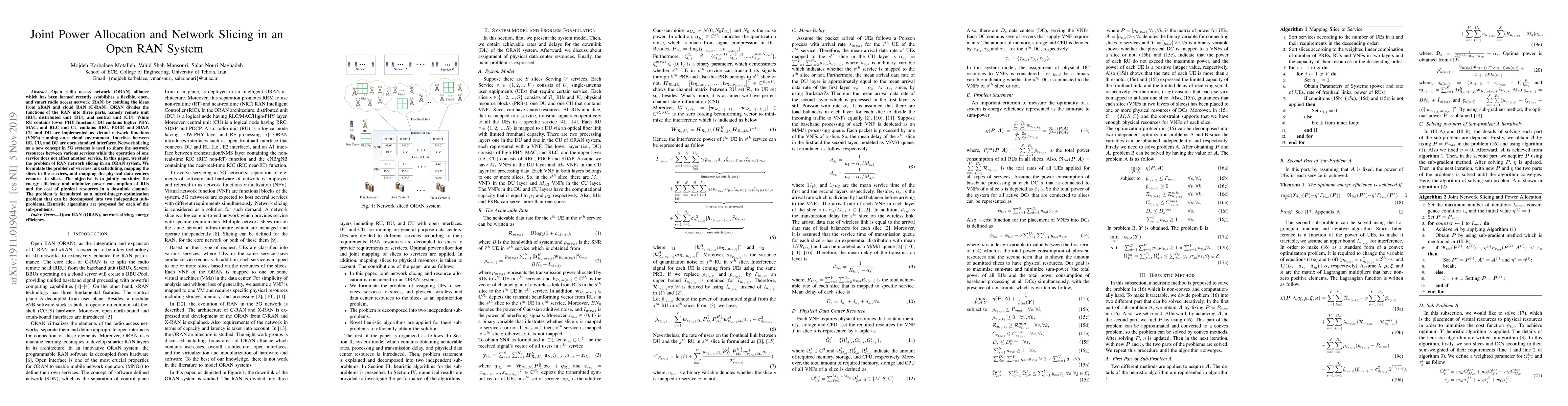 This paper investigates joint power allocation and network slicing in an Open RAN system, aiming to optimize energy efficiency and minimize power consumption while reducing physical resource costs. The study formulates the problem as a mixed-integer optimization problem, proposing heuristic algorithms to address the decomposed sub-problems.