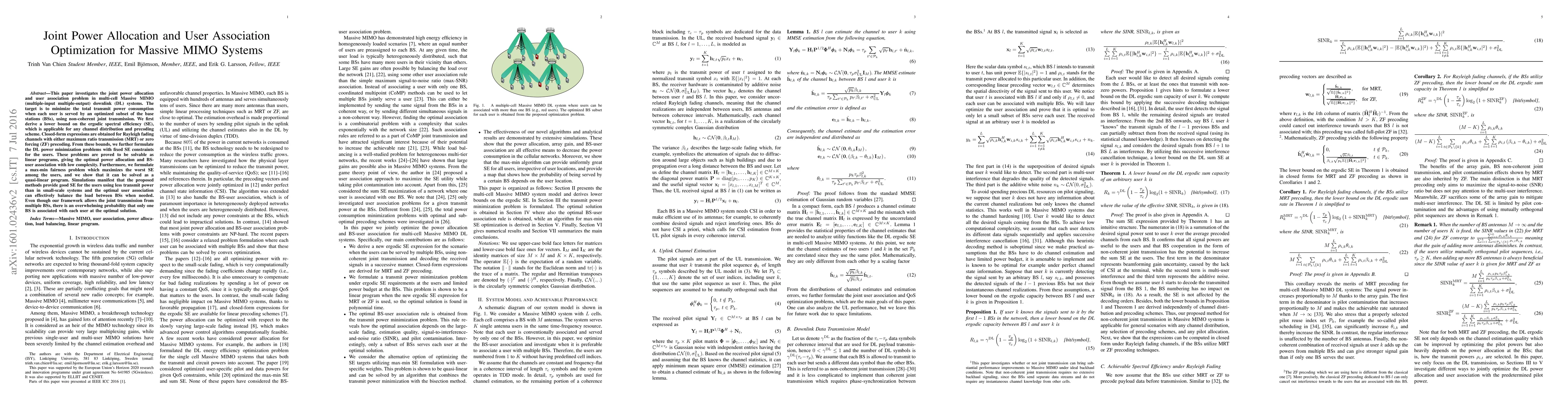 This paper optimizes power allocation and user association in multi-cell Massive MIMO systems to minimize total transmit power while ensuring user service. It formulates the problem as a linear program and quasi-linear program, achieving optimal solutions with low complexity and demonstrating effective load balancing.