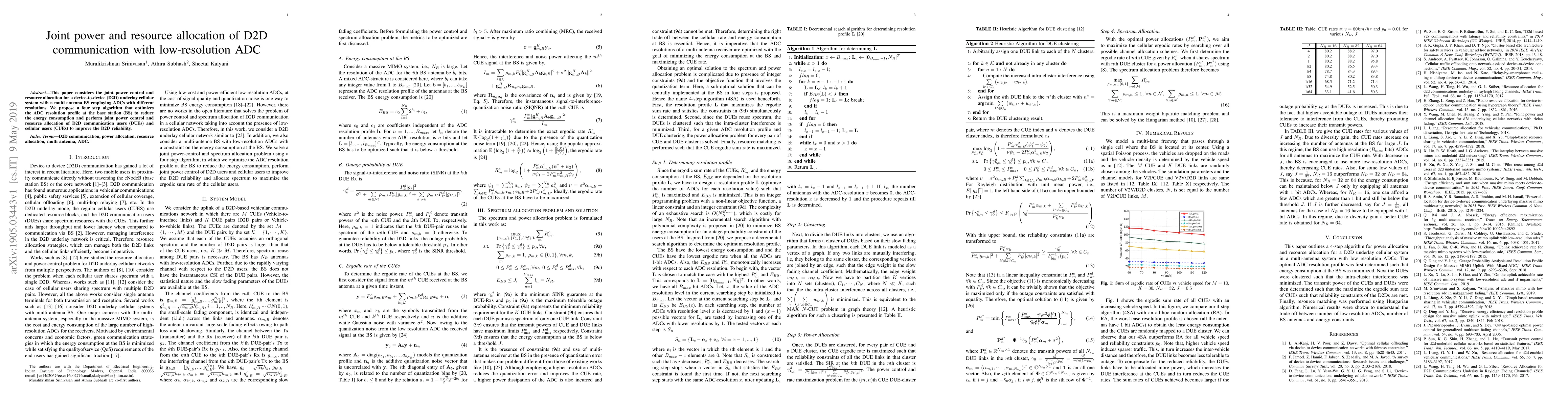 This paper proposes a four-step algorithm for optimizing power control and resource allocation in a D2D underlay system, considering low-resolution ADCs at the base station to enhance D2D reliability and reduce energy consumption. The method jointly manages D2D and cellular users' resources.