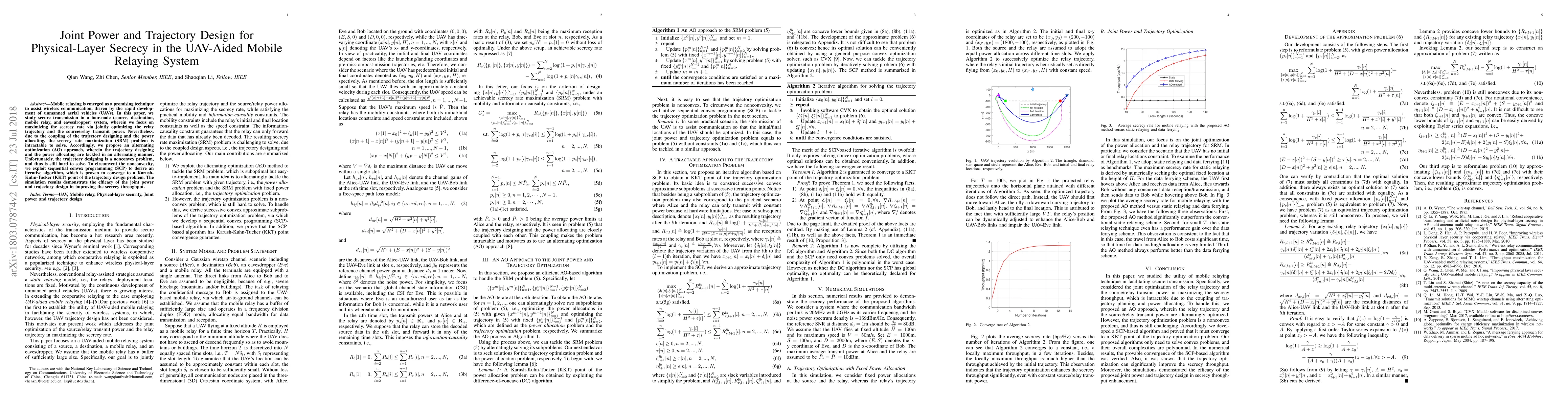 This paper proposes an alternating optimization approach to maximize secrecy rate in a UAV-aided mobile relaying system by jointly optimizing relay trajectory and transmit power. To address the nonconvexity of the trajectory design, sequential convex programming is employed, resulting in an iterative algorithm that converges to a KKT point, enhancing secrecy throughput.