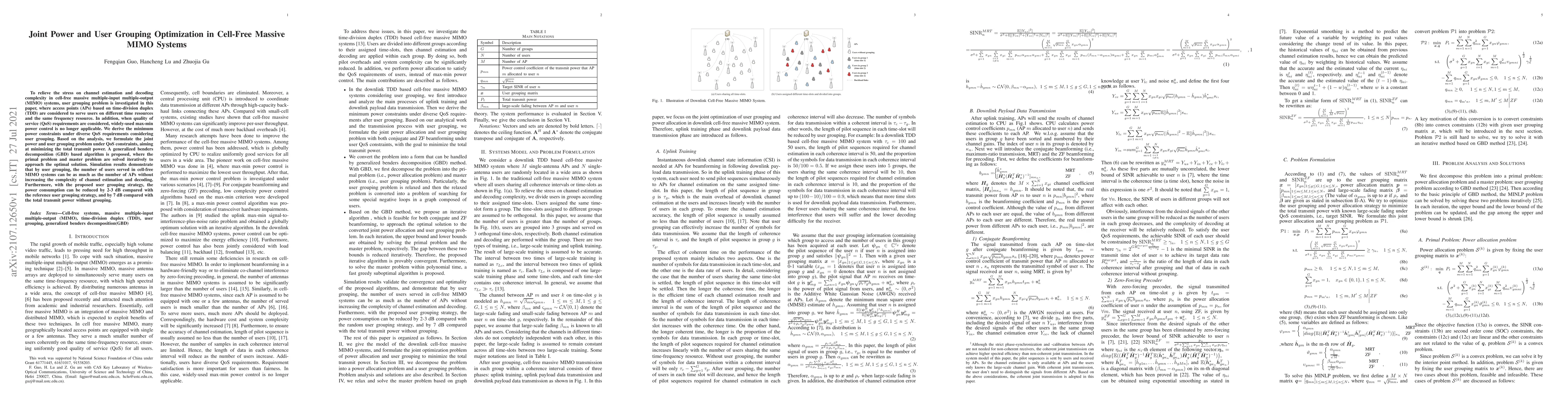 This paper investigates user grouping in cell-free massive MIMO systems to reduce channel estimation and decoding complexity, proposing a joint power and user grouping optimization under QoS constraints. A generalized benders decomposition algorithm is developed to minimize total transmit power, achieving significant power savings and improved user service capacity.