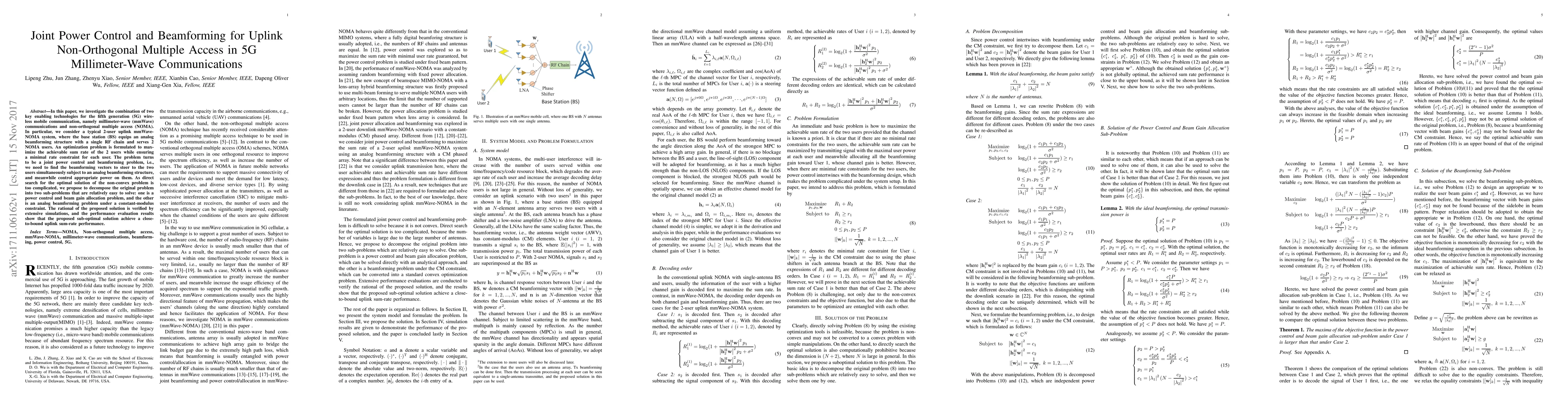 This paper explores the integration of millimeter-wave (mmWave) communications and non-orthogonal multiple access (NOMA) in a 5G uplink system, focusing on optimizing joint power control and beamforming for two users. The proposed solution decomposes the complex optimization problem into manageable sub-problems, achieving near-optimal performance as verified by simulations.