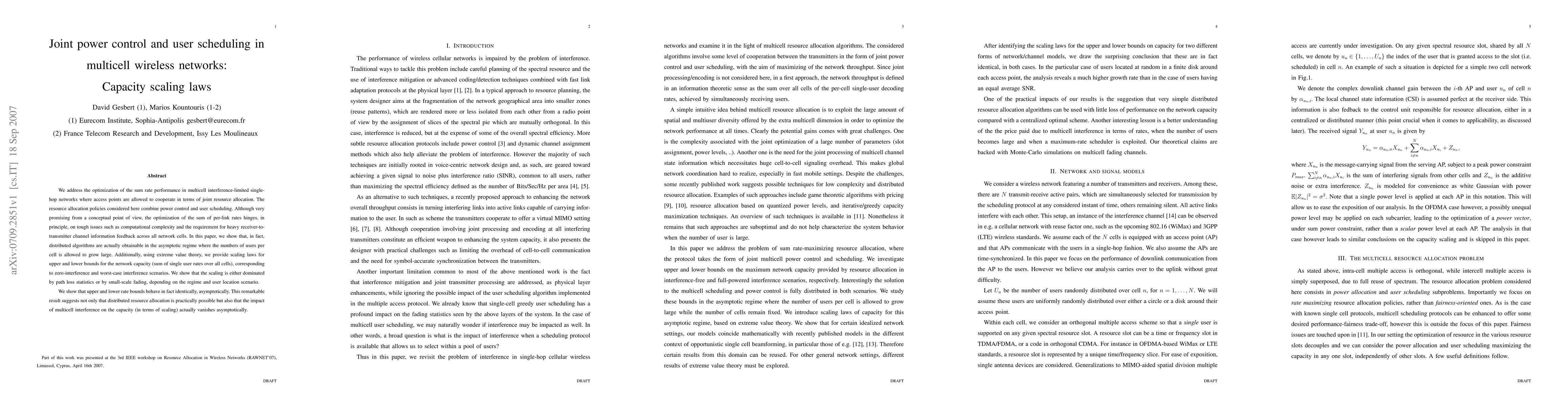 We address the optimization of the sum rate performance in multicell interference-limited singlehop networks where access points are allowed to cooperate in terms of joint resource allocation. The resource allocation policies considered here combine power control and user scheduling. Although very promising from a conceptual point of view, the optimization of the sum of per-link rates hinges, in principle, on tough issues such as computational complexity and the requirement for heavy receiver-to-transmitter channel information feedback across all network cells. In this paper, we show that, in fact, distributed algorithms are actually obtainable in the asymptotic regime where the numbers of users per cell is allowed to grow large. Additionally, using extreme value theory, we provide scaling laws for upper and lower bounds for the network capacity (sum of single user rates over all cells), corresponding to zero-interference and worst-case interference scenarios. We show that the scaling is either dominated by path loss statistics or by small-scale fading, depending on the regime and user location scenario. We show that upper and lower rate bounds behave in fact identically, asymptotically. This remarkable result suggests not only that distributed resource allocation is practically possible but also that the impact of multicell interference on the capacity (in terms of scaling) actually vanishes asymptotically.