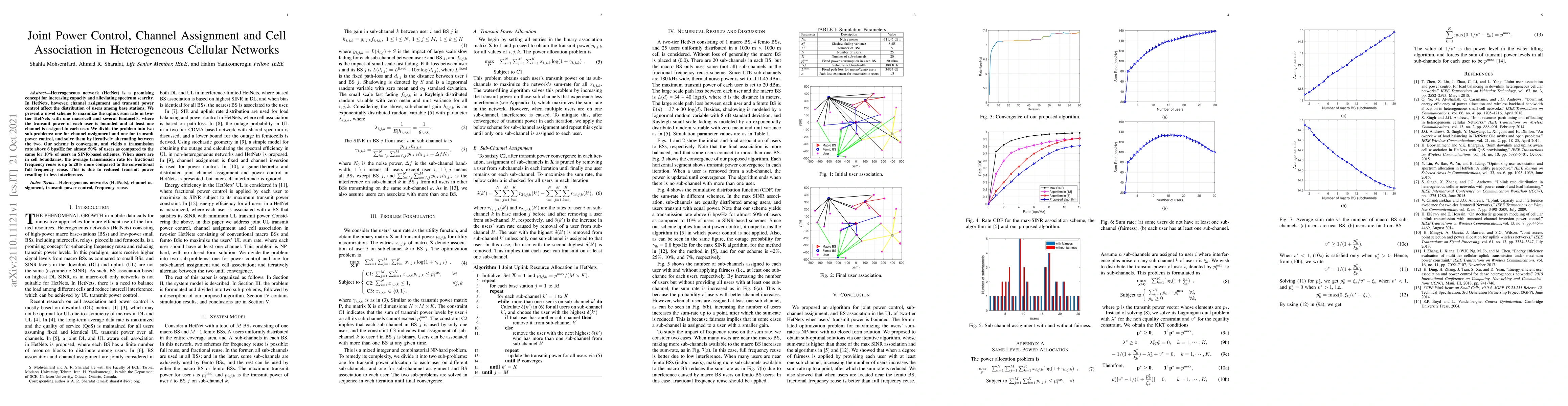A novel scheme for joint power control, channel assignment, and cell association in heterogeneous cellular networks maximizes uplink sum rate with a transmission rate above 6 bps/Hz for almost 50% of users, outperforming SINR-based schemes.