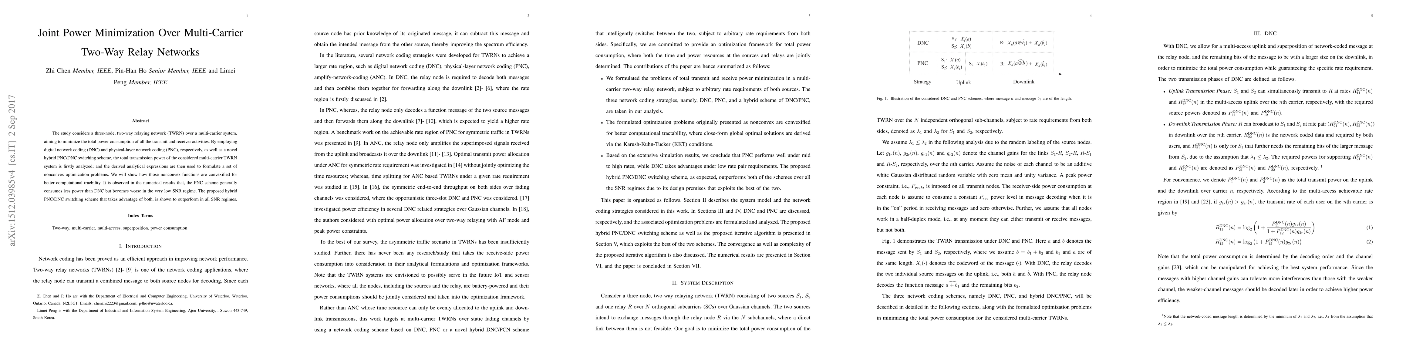 A new hybrid scheme that combines digital network coding (DNC) and physical-layer network coding (PNC) is proposed to minimize power consumption in multi-carrier two-way relay networks. The scheme outperforms traditional PNC and DNC methods across all signal-to-noise ratio (SNR) regimes.