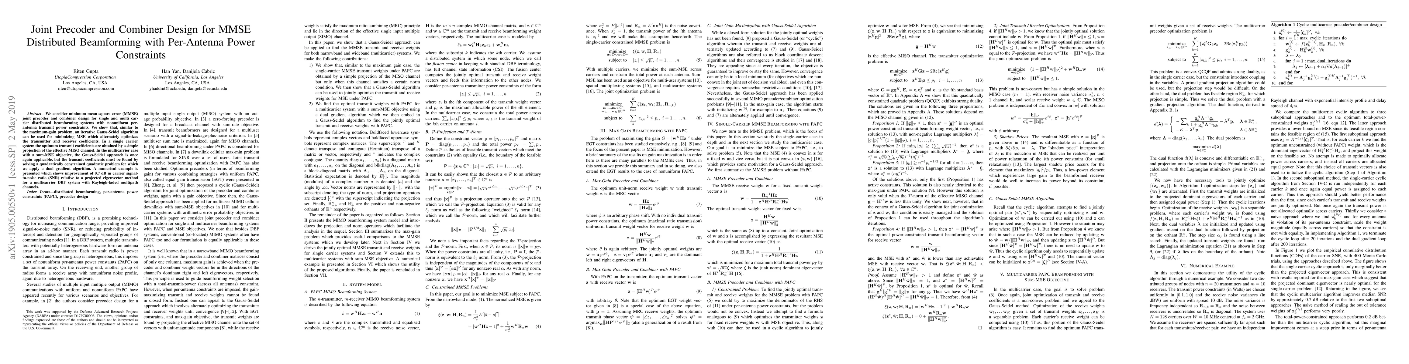 This paper proposes an iterative Gauss-Seidel algorithm for designing joint precoders and combiners in MMSE distributed beamforming systems under per-antenna power constraints, achieving optimal transmit coefficients through simple projection in single carrier systems and solving a quadratically constrained quadratic problem in multicarrier systems.