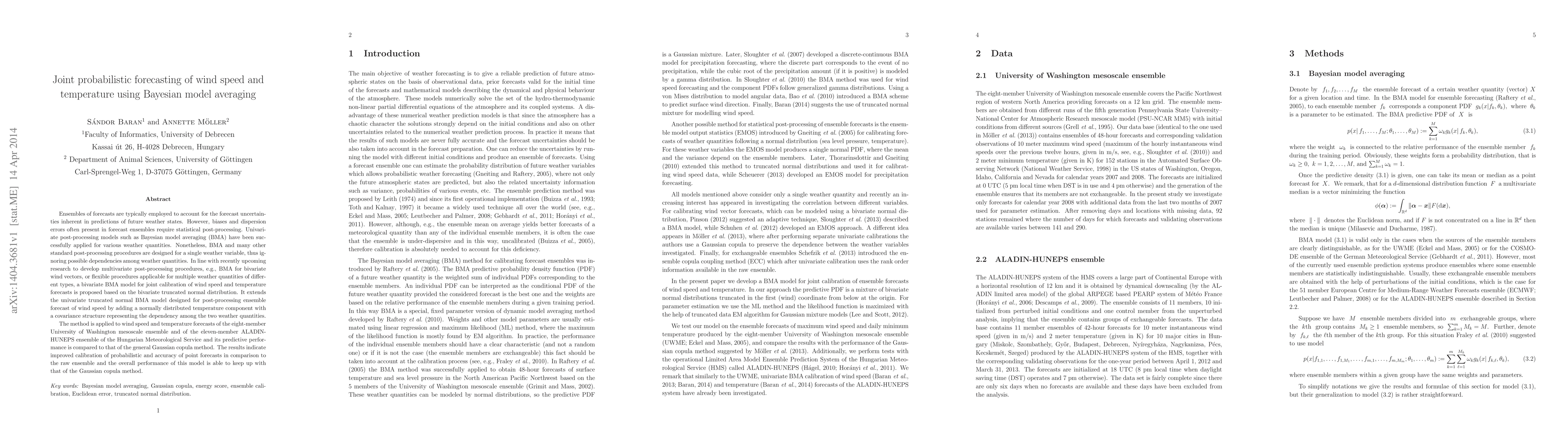 This paper proposes a bivariate Bayesian model averaging (BMA) method for joint probabilistic forecasting of wind speed and temperature, addressing the limitations of univariate BMA by incorporating a covariance structure to account for dependencies between the two weather variables. The method is tested on two ensemble forecasts and shows improved calibration and accuracy compared to raw ensemble forecasts and the general Gaussian copula method.