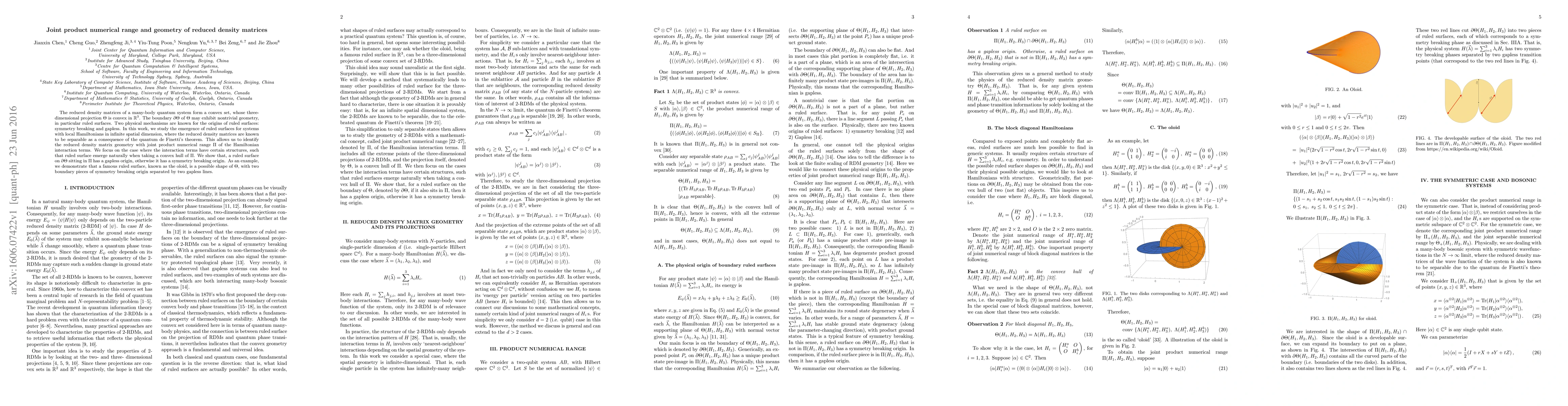 This paper investigates the geometry of reduced density matrices in many-body quantum systems, focusing on the emergence of ruled surfaces in their convex projections. It connects the geometry to the joint product numerical range of Hamiltonian interaction terms, showing that ruled surfaces arise from either symmetry breaking or gapless mechanisms.
