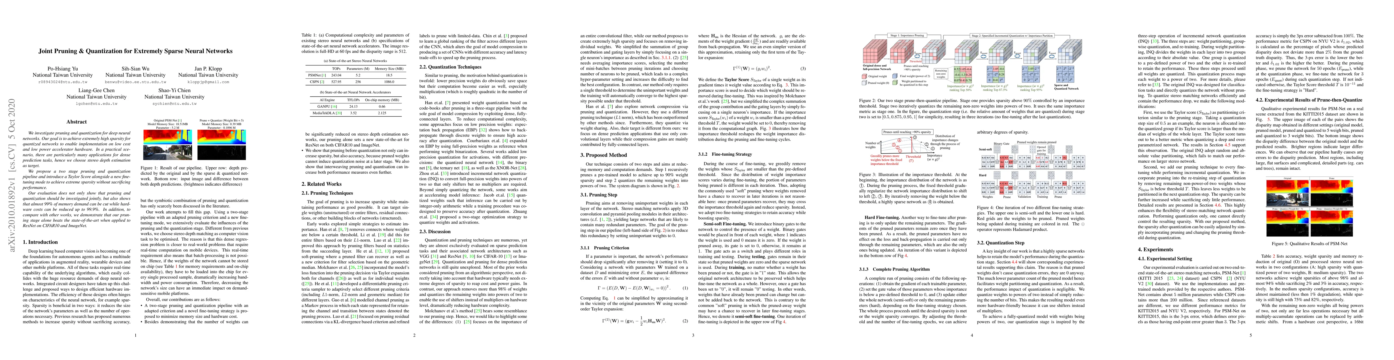 This paper proposes a joint pruning and quantization method to achieve extremely sparse neural networks, enabling efficient implementation on low-cost, low-power hardware. The authors introduce a two-stage pipeline and a Taylor Score for fine-tuning, demonstrating nearly 99% memory reduction and 99.9% hardware cost reduction while maintaining performance, particularly in stereo depth estimation tasks.