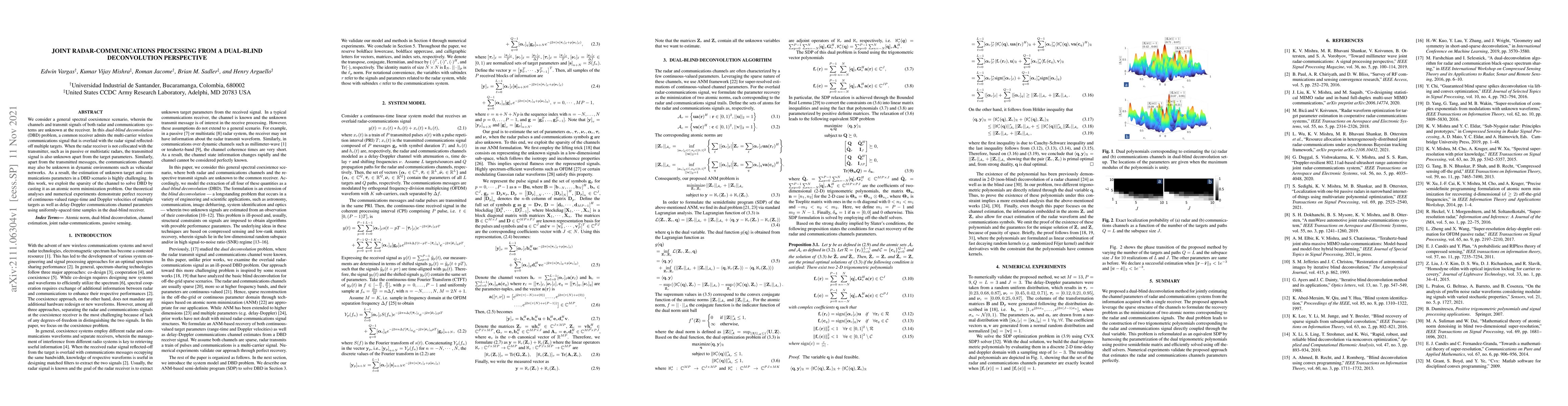 This paper addresses the dual-blind deconvolution problem in spectral coexistence scenarios where both radar and communication systems' channels and signals are unknown. The authors propose an atomic norm minimization approach to exploit channel sparsity, achieving perfect recovery of target and communication parameters.