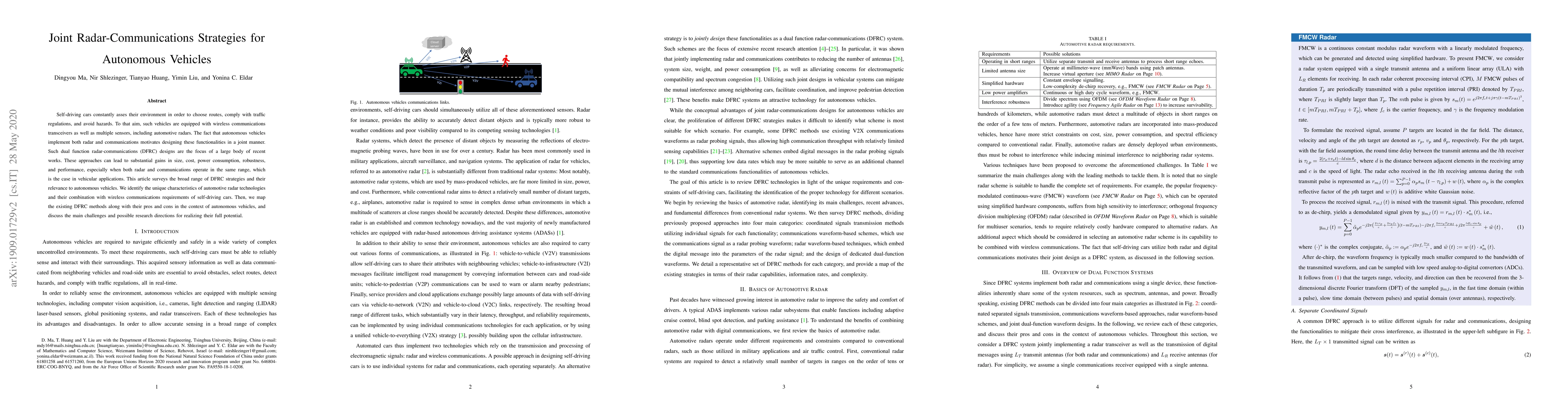 Self-driving cars constantly asses their environment in order to choose routes, comply with traffic regulations, and avoid hazards. To that aim, such vehicles are equipped with wireless communications transceivers as well as multiple sensors, including automotive radars. The fact that autonomous vehicles implement both radar and communications motivates designing these functionalities in a joint manner. Such dual function radar-communications (DFRC) designs are the focus of a large body of recent works. These approaches can lead to substantial gains in size, cost, power consumption, robustness, and performance, especially when both radar and communications operate in the same range, which is the case in vehicular applications. This article surveys the broad range of DFRC strategies and their relevance to autonomous vehicles. We identify the unique characteristics of automotive radar technologies and their combination with wireless communications requirements of self-driving cars. Then, we map the existing DFRC methods along with their pros and cons in the context of autonomous vehicles, and discuss the main challenges and possible research directions for realizing their full potential.
