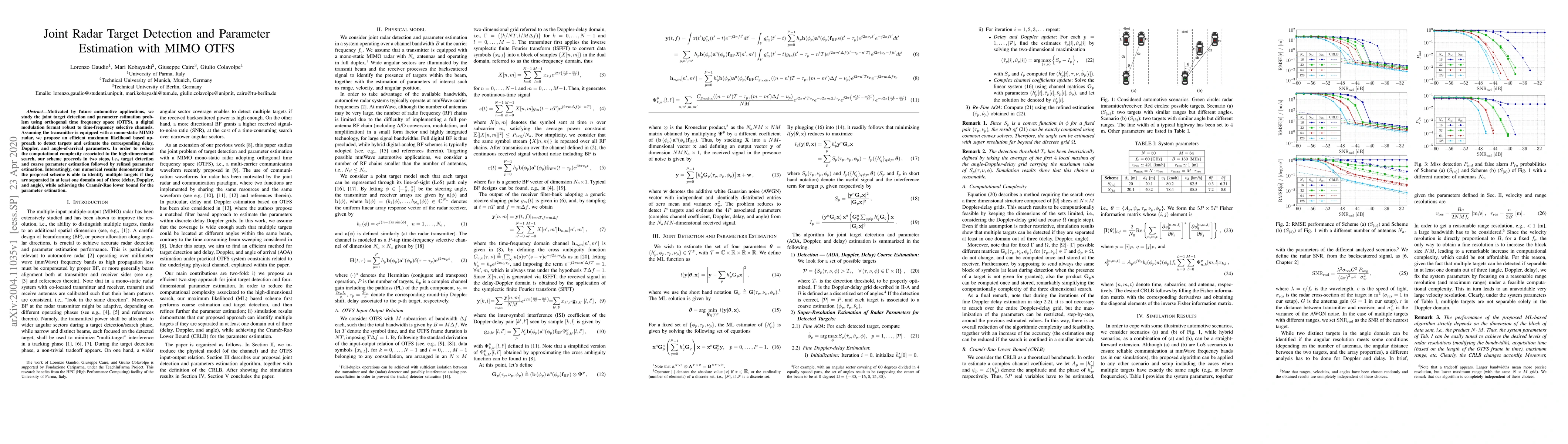 This paper proposes an efficient maximum likelihood approach for joint radar target detection and parameter estimation using MIMO OTFS, achieving high accuracy and computational efficiency through a two-step scheme. The method identifies multiple targets separated in at least one domain and reaches the Cramér-Rao lower bound for parameter estimation.